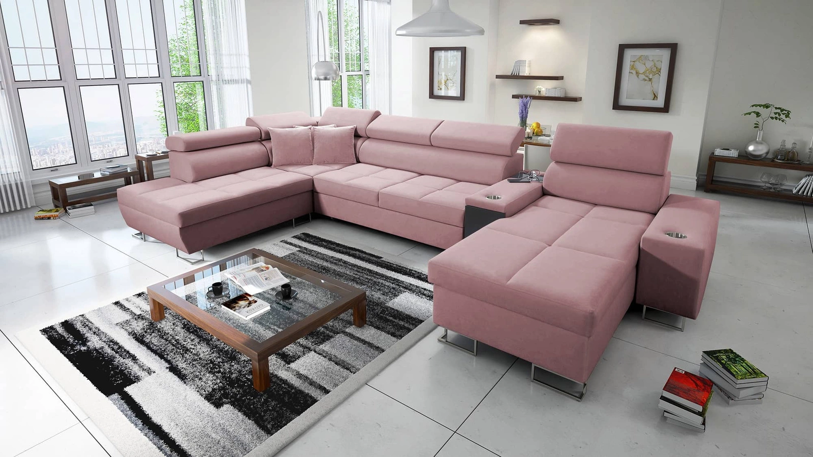Narożnik z funkcją spania Dafni V indyjski róż prawostronny velvet wygodny i komfortowy narożnik z regulowanymi zagłówkami