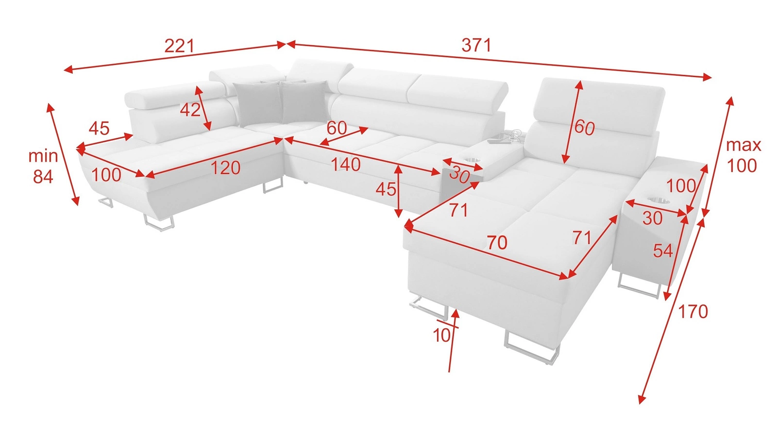 Wymiary mebla są optymalne. Szerokość narożnika 371 cm, wysokość maksymalna 100 cm oraz głębokość 221 cm. Powierzchnia spania narożnika wynosi 127x195 cm. Wysokość siedziska mebla to 45 cm a maksymalna wysokość oparcia wynosi 60 cm. Sprężyny faliste oraz pianka poliuretanowa T30 to materiał, z którego wykonane zostało siedzisko narożnika. Oparcie stałe z regulowanymi zagłówkami daje gwarancję wygodnego wypoczynku po długim dniu, które docenią wszyscy, którzy zasiądą na tym wyjątkowym narożniku! Narożnik wykonany został z wysokiej jakości materiałów, które charakteryzują się odpornością na wpływ czynników zewnętrznych takich jak obicia mebla oraz różnego typu uderzenia.