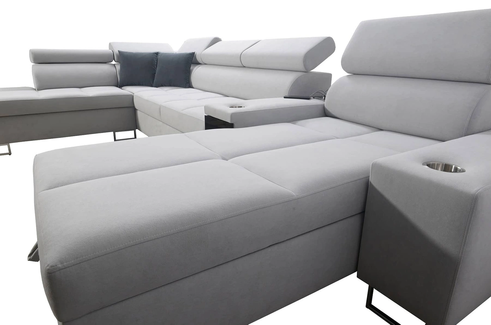 Dodatki tego mebla, które docenią wszyscy użytkownicy to dwa pojemniki na pościel, funkcja spania, uchwyty na kubki w boczkach, gniazdo ładowania USB i gniazdo elektryczne w boczku narożnika oraz szuflada z systemem pełnego wysuwu w boczku mebla.