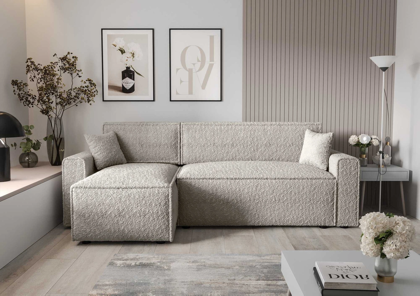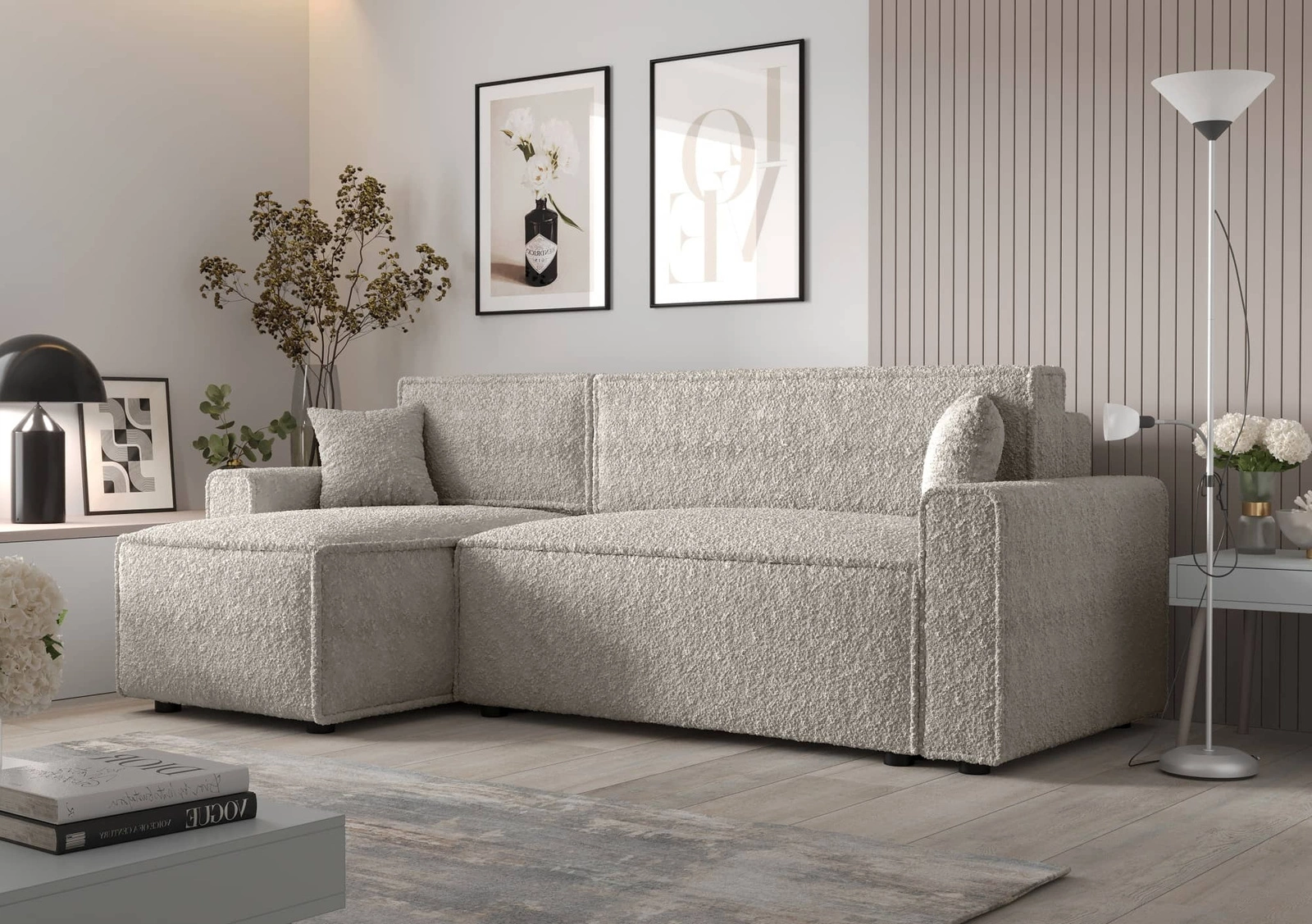 Narożnik z funkcją spania Brandon Bis kremowy lewostronny miękka tkanina o charakterystycznej pętelkowej powierzchni pojemnik na pościel