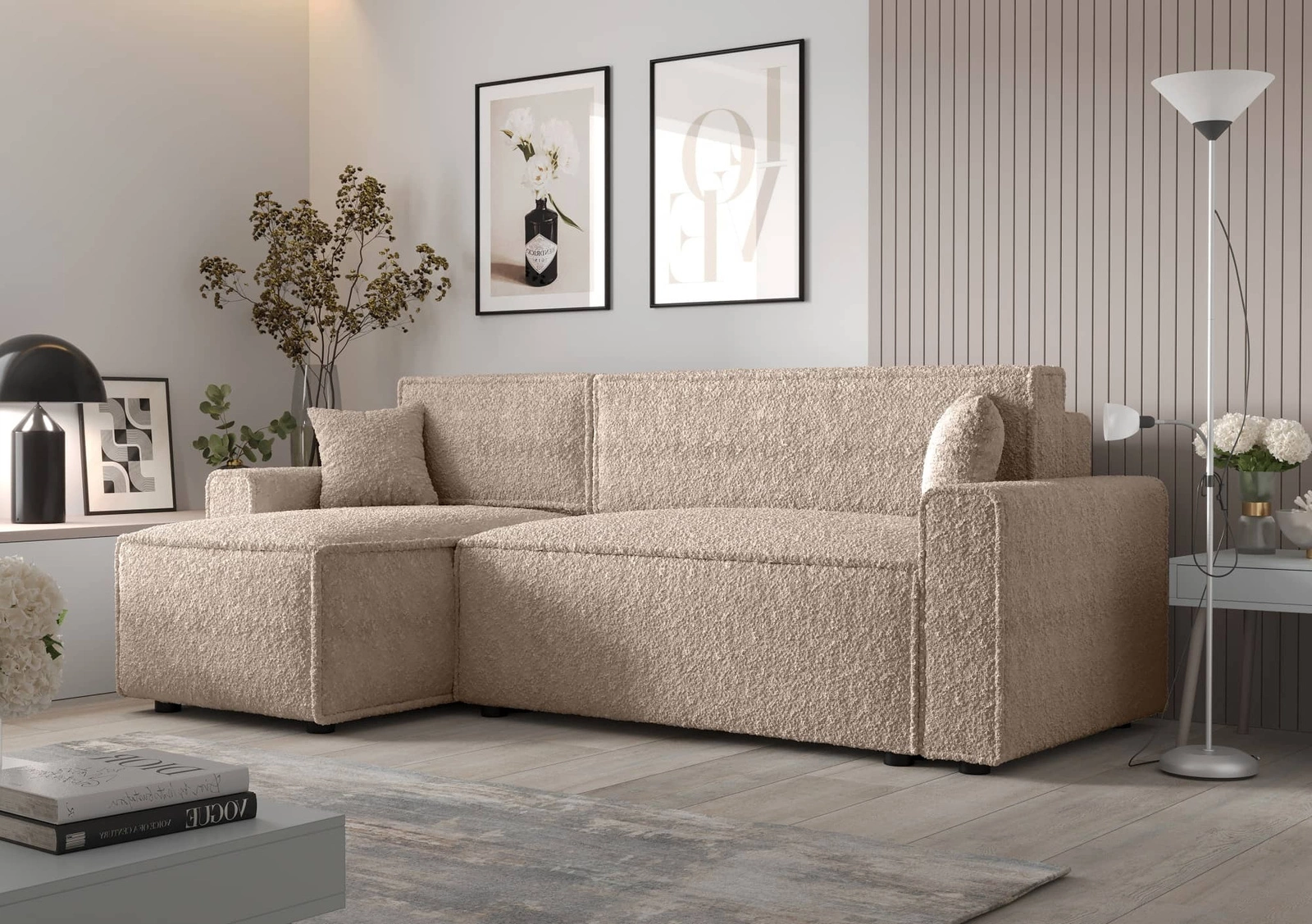 Narożnik z funkcją spania Brandon Bis beżowy lewostronny miękka tkanina o charakterystycznej pętelkowej powierzchni pojemnik na pościel