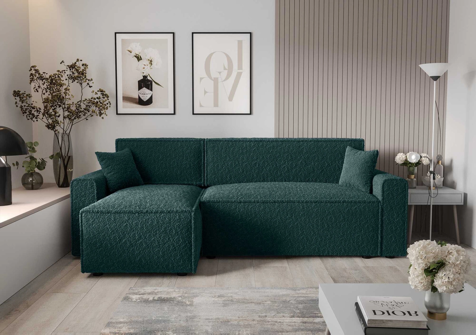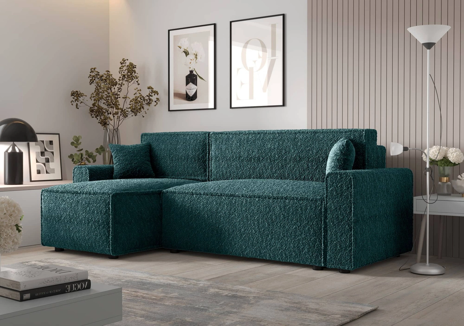 Narożnik z funkcją spania Brandon Bis turkusowy lewostronny miękka tkanina o charakterystycznej pętelkowej powierzchni pojemnik na pościel