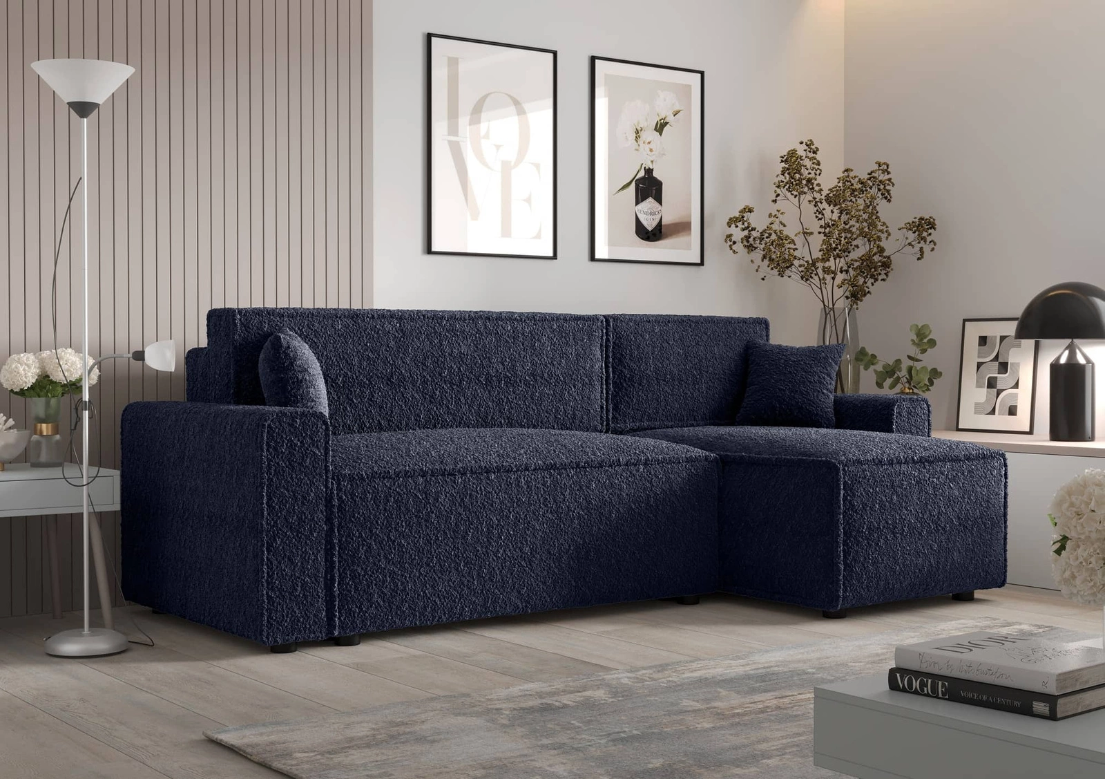 Narożnik z funkcją spania Brandon Bis granatowy prawostronny miękka tkanina o charakterystycznej pętelkowej powierzchni pojemnik na pościel