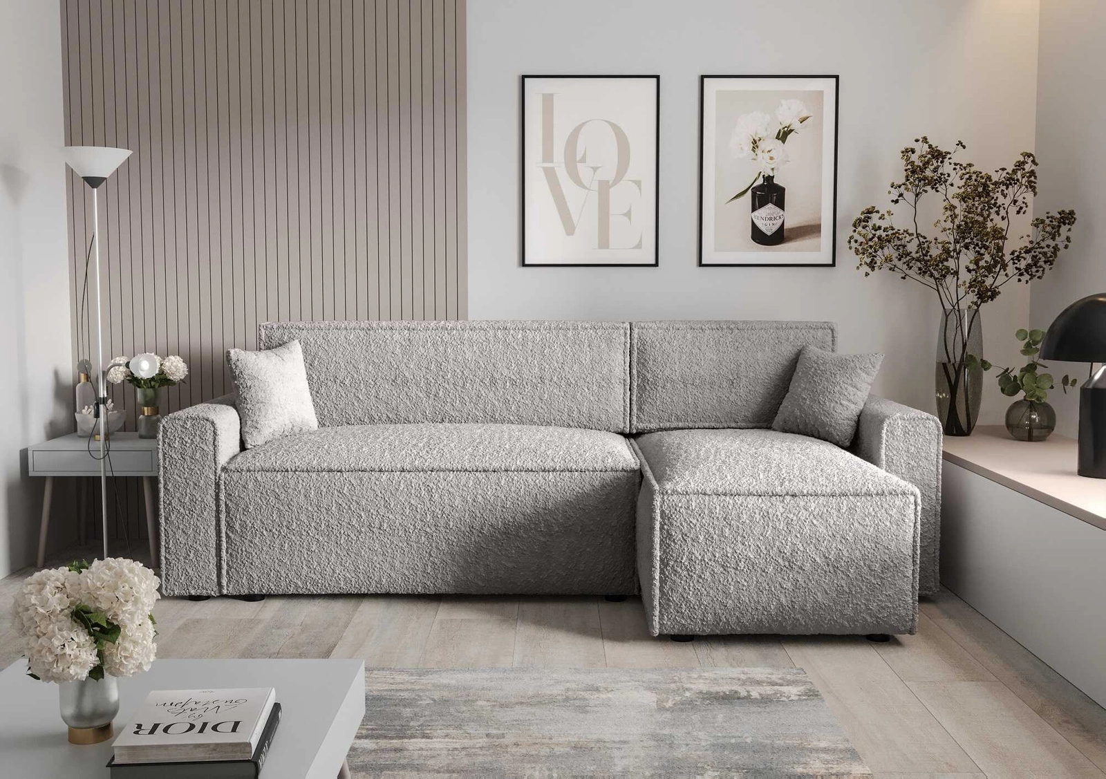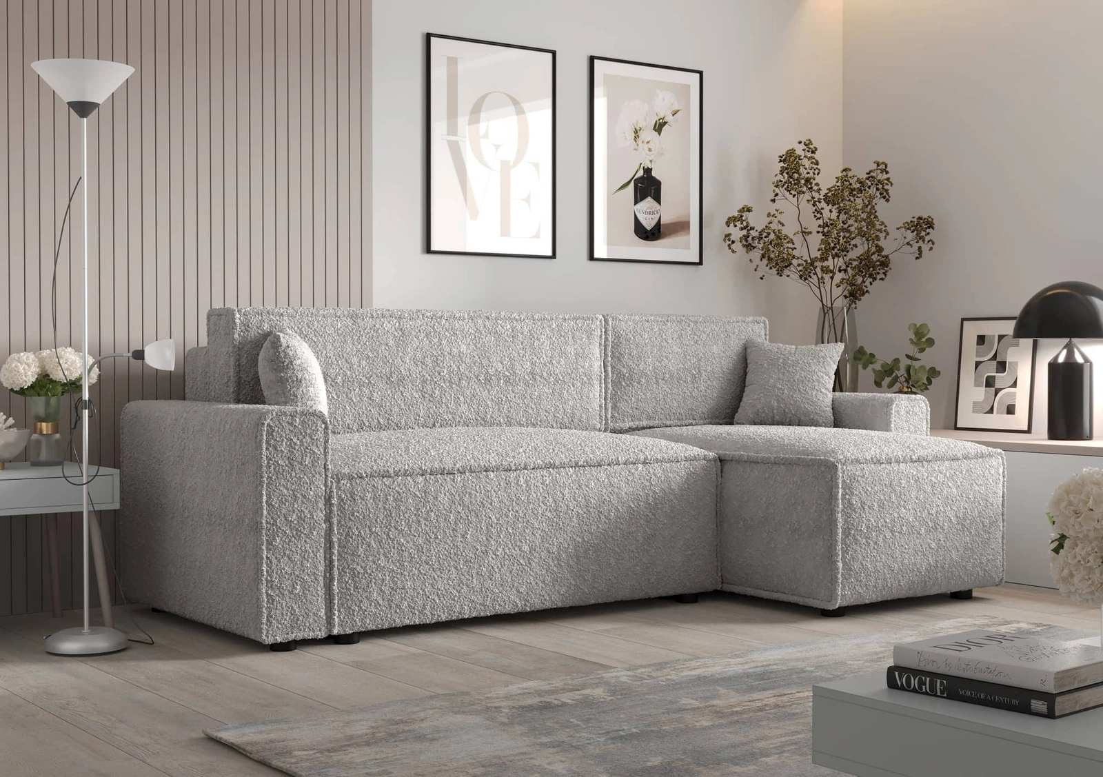Narożnik z funkcją spania Brandon Bis szary popiel prawostronny miękka tkanina o charakterystycznej pętelkowej powierzchni pojemnik na pościel