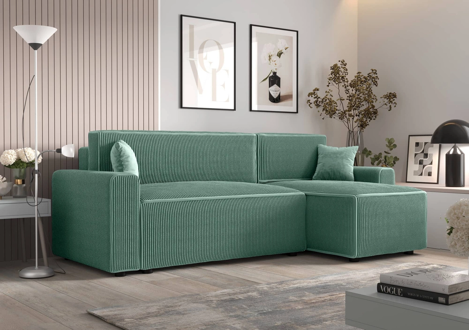 Narożnik z funkcją spania Brandon Bis to prosty mebel o nowoczesnym designie, który idealnie wkomponuje się w każdą aranżację. Narożnik w całości pokryty został tkaniną typu welur Poso 26. Trójwymiarowa sztruksowa tkanina o wyrazistych i grubych prążkach nadaje szczególnego charakteru oraz nadaje kanapie wyjątkowej urody. Tkanina jest bardzo miękka, a przy tym mocna i wytrzymała. Tkanina obiciowa Poso jest odporna na ścieranie, a także łatwa do utrzymania w czystości. Dzięki temu narożnik rozkładany Brandon Bis przez długi czas będzie wyglądał estetycznie i elegancko. Narożnik z funkcją spania codziennego wykonany został z wysokiej jakości materiałów, które charakteryzują się odpornością na wpływ czynników zewnętrznych takich jak obicia mebla oraz różnego typu uderzenia.