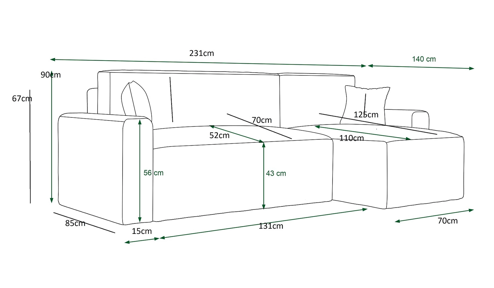 Dzięki swoim optymalnym wymiarom oraz szerokiej funkcjonalności narożnik z funkcją spania świetnie sprawdzi się jako narożnik do pokoju dziennego lub jako narożnik rozkładany do pokoju nastolatka. Szerokość narożnika 231 cm, wysokość maksymalna 90 cm oraz głębokość 140 cm. Powierzchnia spania narożnika wynosi 125x201 cm. Wysokość siedziska mebla to 43 cm, a wysokość oparcia wynosi 47 cm. Sprężyny faliste oraz pianka HR30 to materiał, z którego wykonane zostało siedzisko narożnika. Oparcie poduchy daje gwarancję wygodnego wypoczynku po długim dniu, które docenisz Ty, a także goście, którzy zasiądą na tym wyjątkowym narożniku!