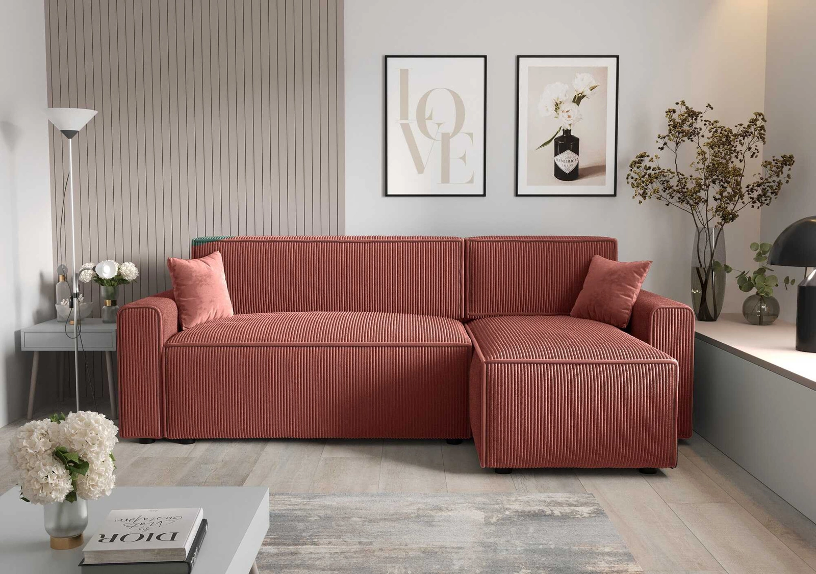 Narożnik z funkcją spania Brandon Bis indyjski róż prawostronny trójwymiarowa tkanina o wyrazistych prążkach pojemnik na pościel