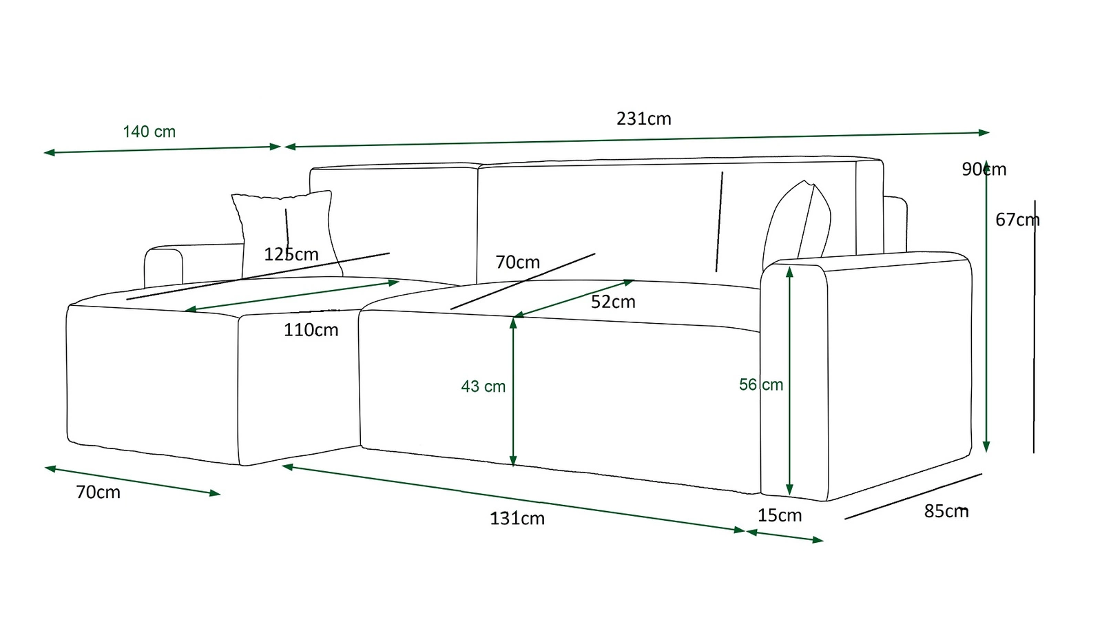 Dzięki swoim optymalnym wymiarom oraz szerokiej funkcjonalności narożnik z funkcją spania świetnie sprawdzi się jako narożnik do pokoju dziennego lub jako narożnik rozkładany do pokoju nastolatka. Szerokość narożnika 231 cm, wysokość maksymalna 90 cm oraz głębokość 140 cm. Powierzchnia spania narożnika wynosi 125x201 cm. Wysokość siedziska mebla to 43 cm, a wysokość oparcia wynosi 47 cm. Sprężyny faliste oraz pianka HR30 to materiał, z którego wykonane zostało siedzisko narożnika. Oparcie poduchy daje gwarancję wygodnego wypoczynku po długim dniu, które docenisz Ty, a także goście, którzy zasiądą na tym wyjątkowym narożniku!