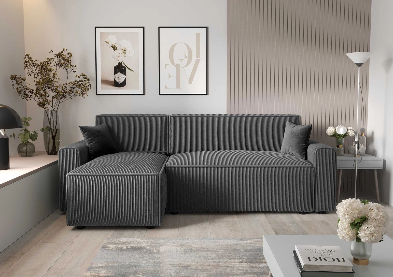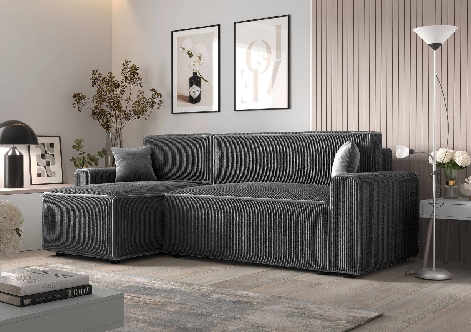 Narożnik z funkcją spania Brandon Bis szary lewostronny trójwymiarowa tkanina o wyrazistych prążkach pojemnik na pościel