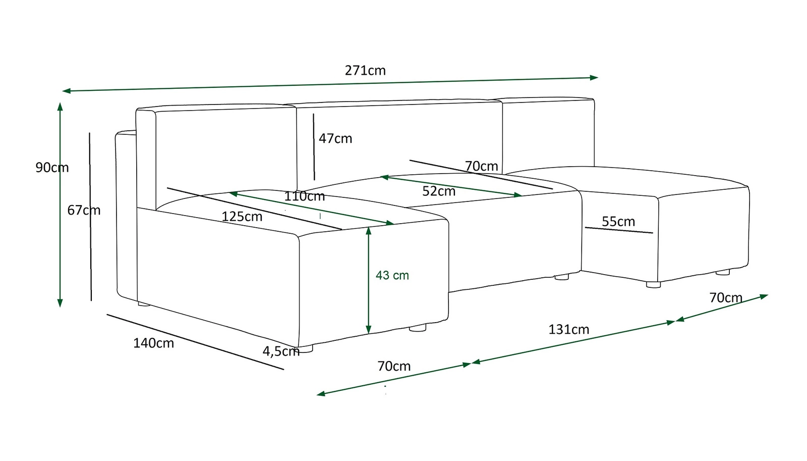 Dzięki swoim optymalnym wymiarom oraz szerokiej funkcjonalności narożnik z funkcją spania świetnie sprawdzi się jako narożnik do pokoju dziennego lub jako narożnik rozkładany do pokoju nastolatka. Szerokość narożnika 271 cm, wysokość maksymalna 90 cm oraz głębokość 140 cm. Powierzchnia spania narożnika wynosi 125x271 cm. Wysokość siedziska mebla to 43 cm, a wysokość oparcia wynosi 47 cm. Sprężyny faliste oraz pianka HR30 to materiał, z którego wykonane zostało siedzisko narożnika. Oparcie poduchy daje gwarancję wygodnego wypoczynku po długim dniu, które docenisz Ty, a także goście, którzy zasiądą na tym wyjątkowym narożniku!