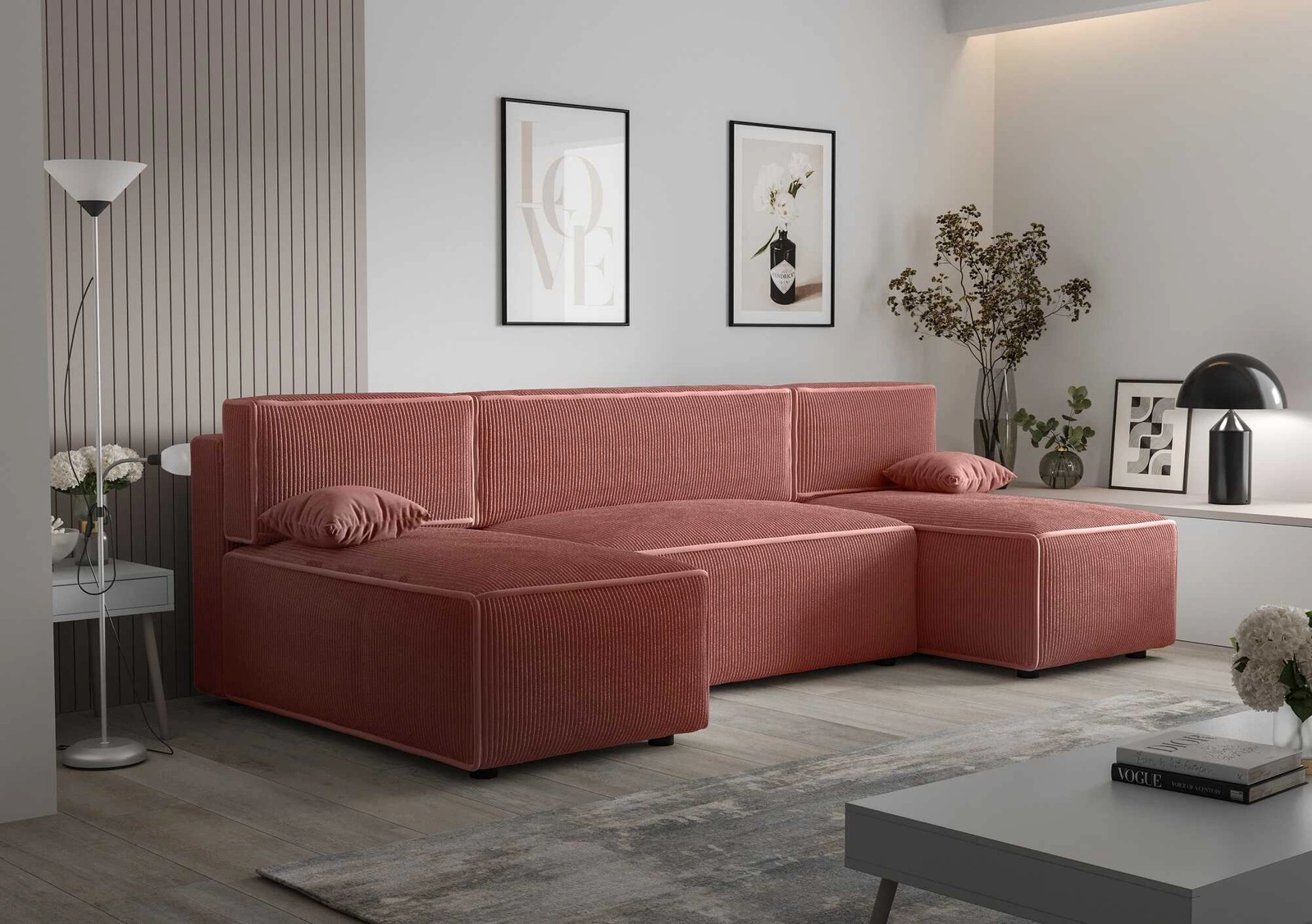 Narożnik z funkcją spania Brandon U indyjski róż pojemnik na pościel trójwymiarowa tkanina o wyrazistych prążkach