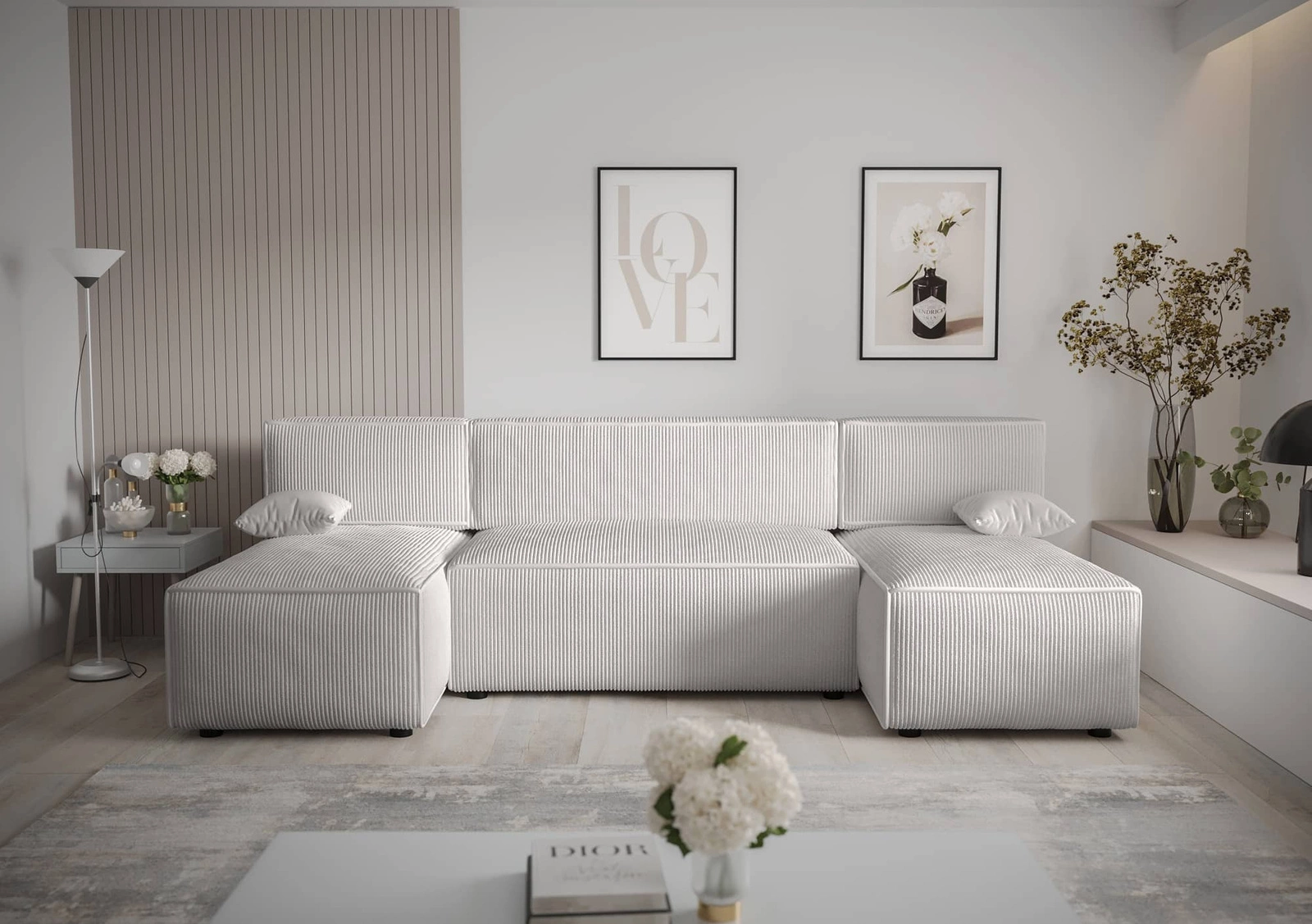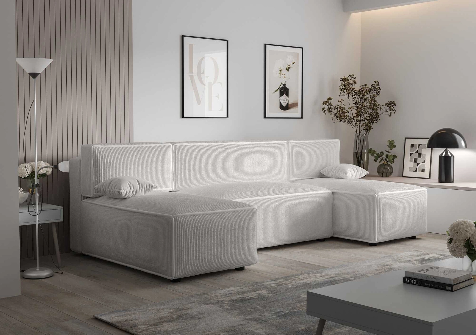 Narożnik z funkcją spania Brandon U kość słoniowa pojemnik na pościel trójwymiarowa tkanina o wyrazistych prążkach