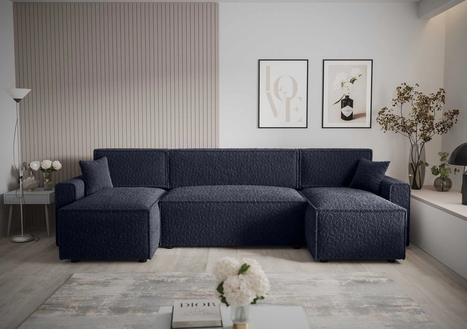 Narożnik z funkcją spania Brandon U Bis granatowy pojemnik na pościel podłokietniki tkanina o charakterystycznej pętelkowej powierzchni