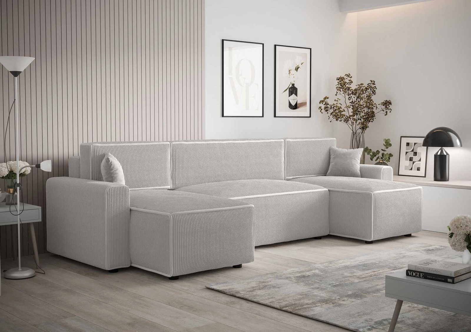 Narożnik z funkcją spania Brandon U Bis kość słoniowa pojemnik na pościel trójwymiarowa tkanina o wyrazistych prążkach miękkie podłokietniki