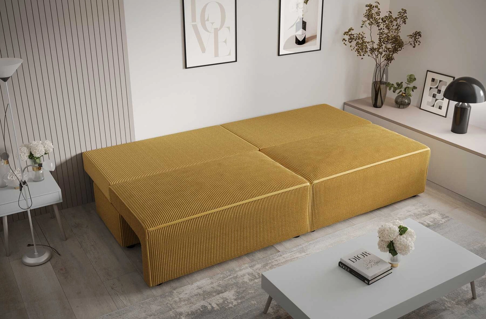Kanapa Brandon XL jest wyposażona w pojemnik na pościel, po rozłożeniu zyskujemy miejsce do spania.