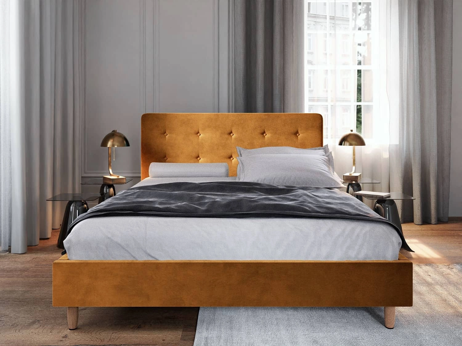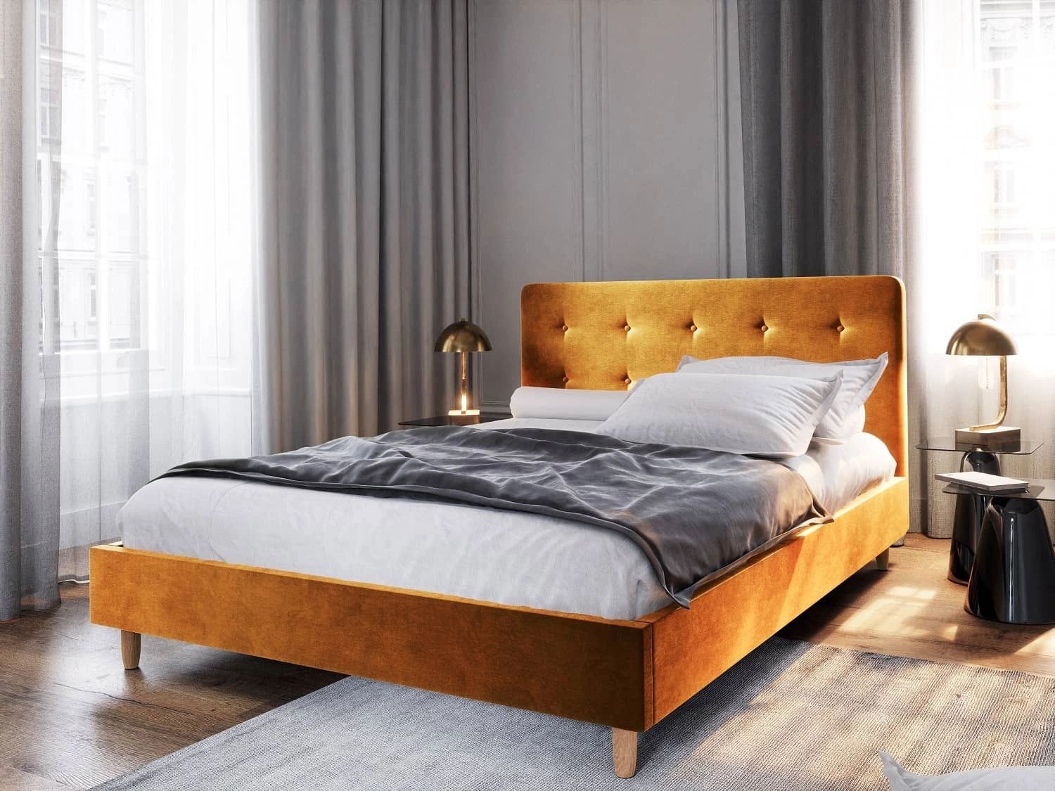 Łóżko tapicerowane Noiro 140x200 w kolorze musztardowym to stylowy mebel, który idealnie wkomponuje się do każdej sypialni.
