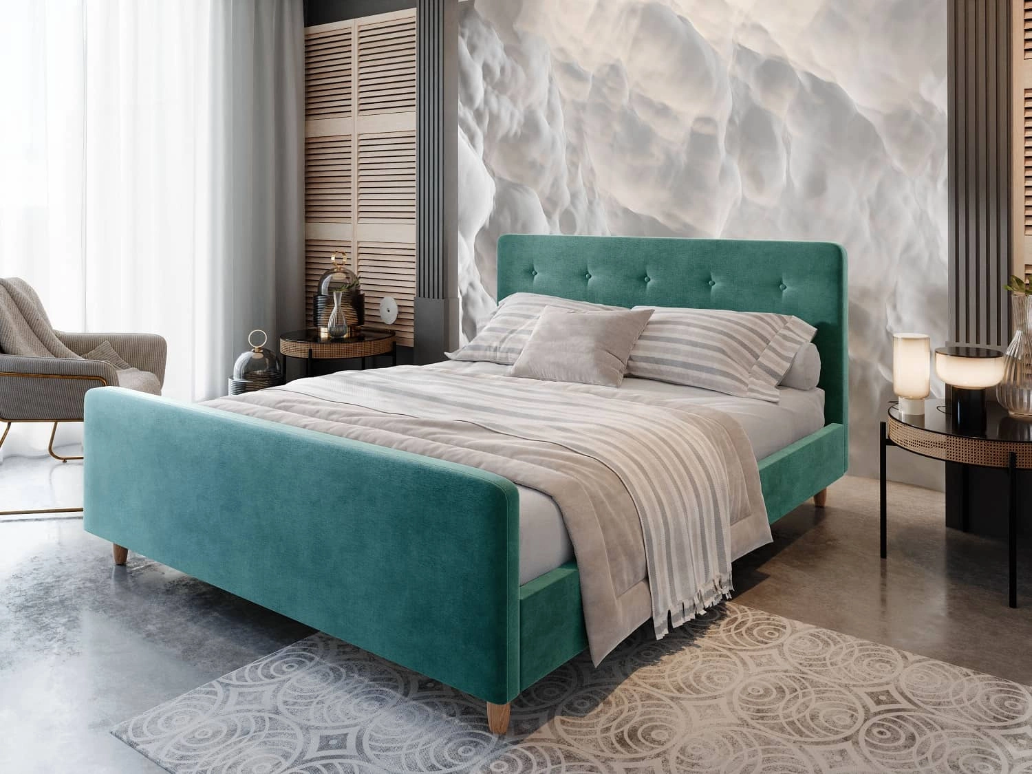 Łóżko wykonane z tkaniny typu plusz Itaka 9 gwarantuje najwyższy komfort i funkcjonalność podczas codziennego wypoczynku w sypialni. Tkanina jest wyprodukowana w technologii easy clean oraz wykazuje właściwości ograniczające wchłanianie cieczy. Dzięki wszystkim właściwościom użytej tkaniny, łóżko tapicerowane na długo zachowa swój pierwotny wygląd. Konstrukcja łóżka zapewnia dużą stabilność i wygodę użytkowania. Konstrukcja łóżka zapewnia dużą stabilność i wygodę użytkowania. Rama łóżka jest wykonana z drewna oraz płyty meblowej. Łóżko posiada zanóżek oraz pikowane wezgłowie, które przyciąga wzrok i nadaje łóżku szczególnego charakteru. Nogi łóżka są wykonane z drewna bukowego.