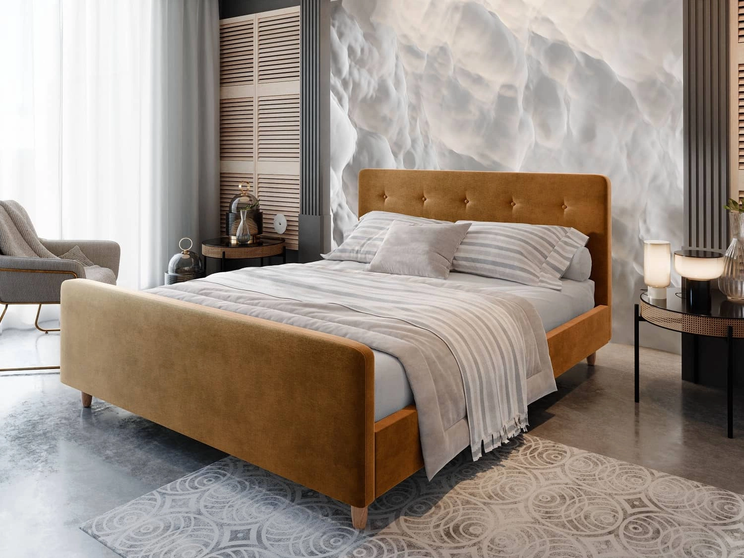 Łóżko tapicerowane Isara 160x200 w kolorze musztardowym to stylowy mebel, który idealnie wkomponuje się do każdej sypialni.