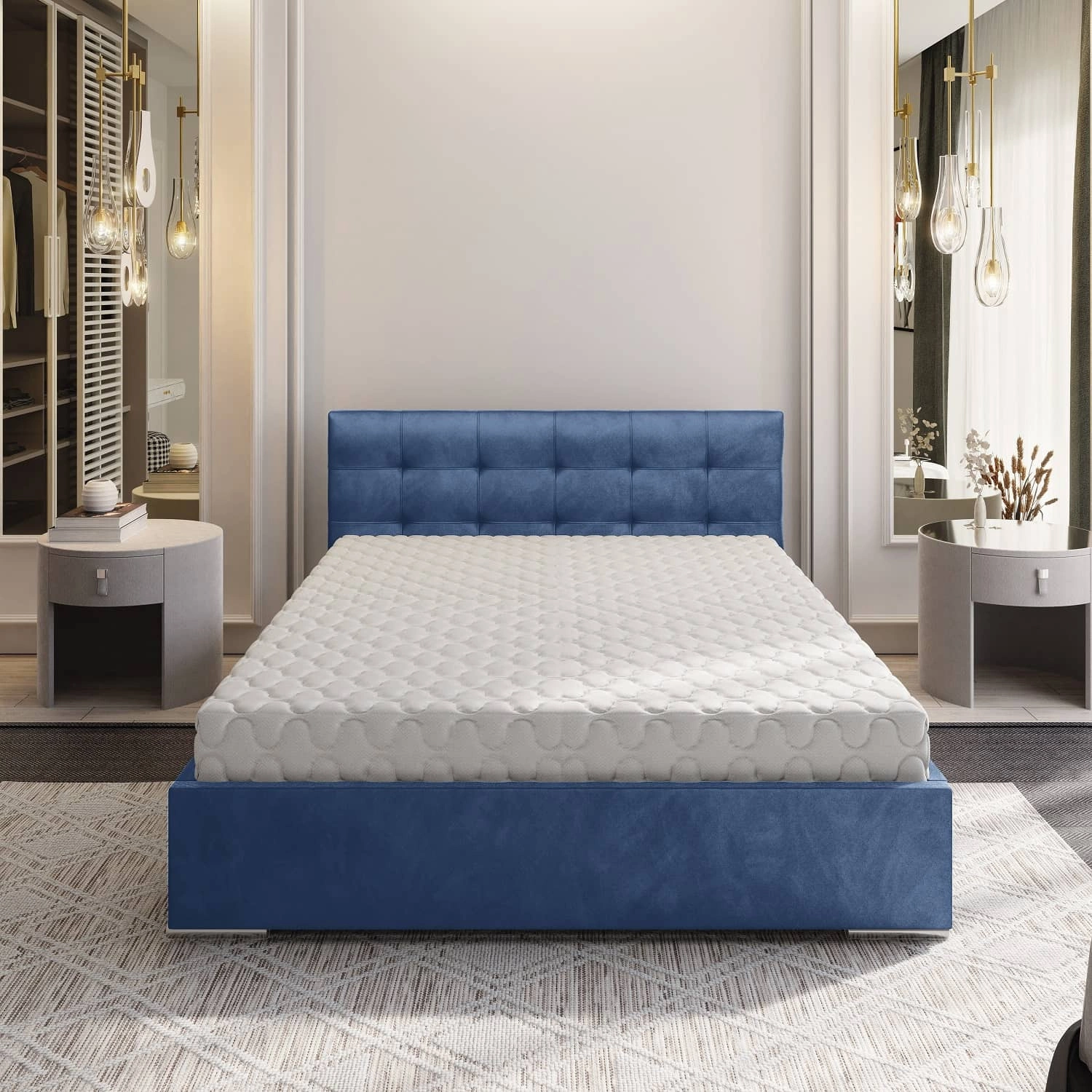 Łóżko tapicerowane Montigo 160x200 błękitne z pojemnikiem w nowoczesnym skandynawskim stylu z pikowanym zagłówkiem