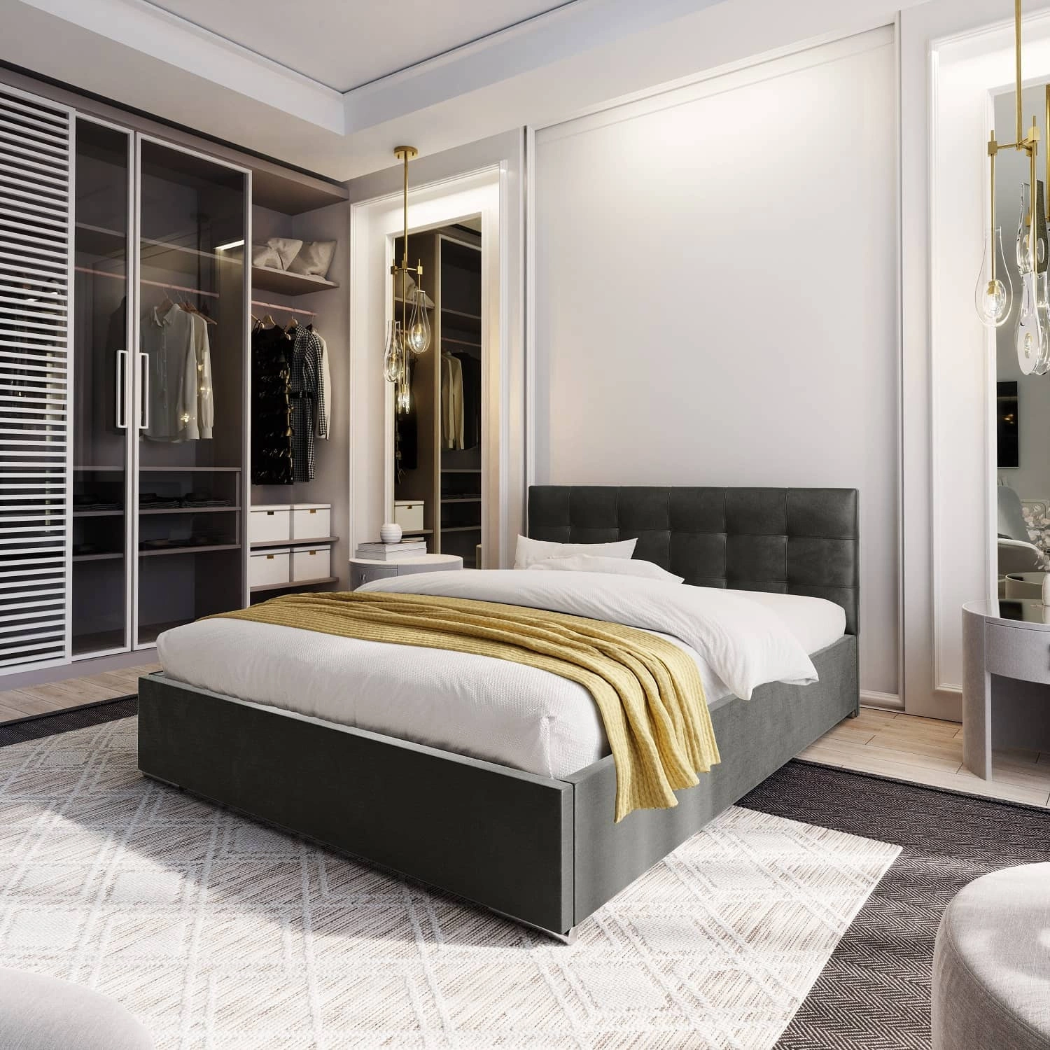 Łóżko tapicerowane Montigo 160x200 szare z pojemnikiem w nowoczesnym skandynawskim stylu z pikowanym zagłówkiem