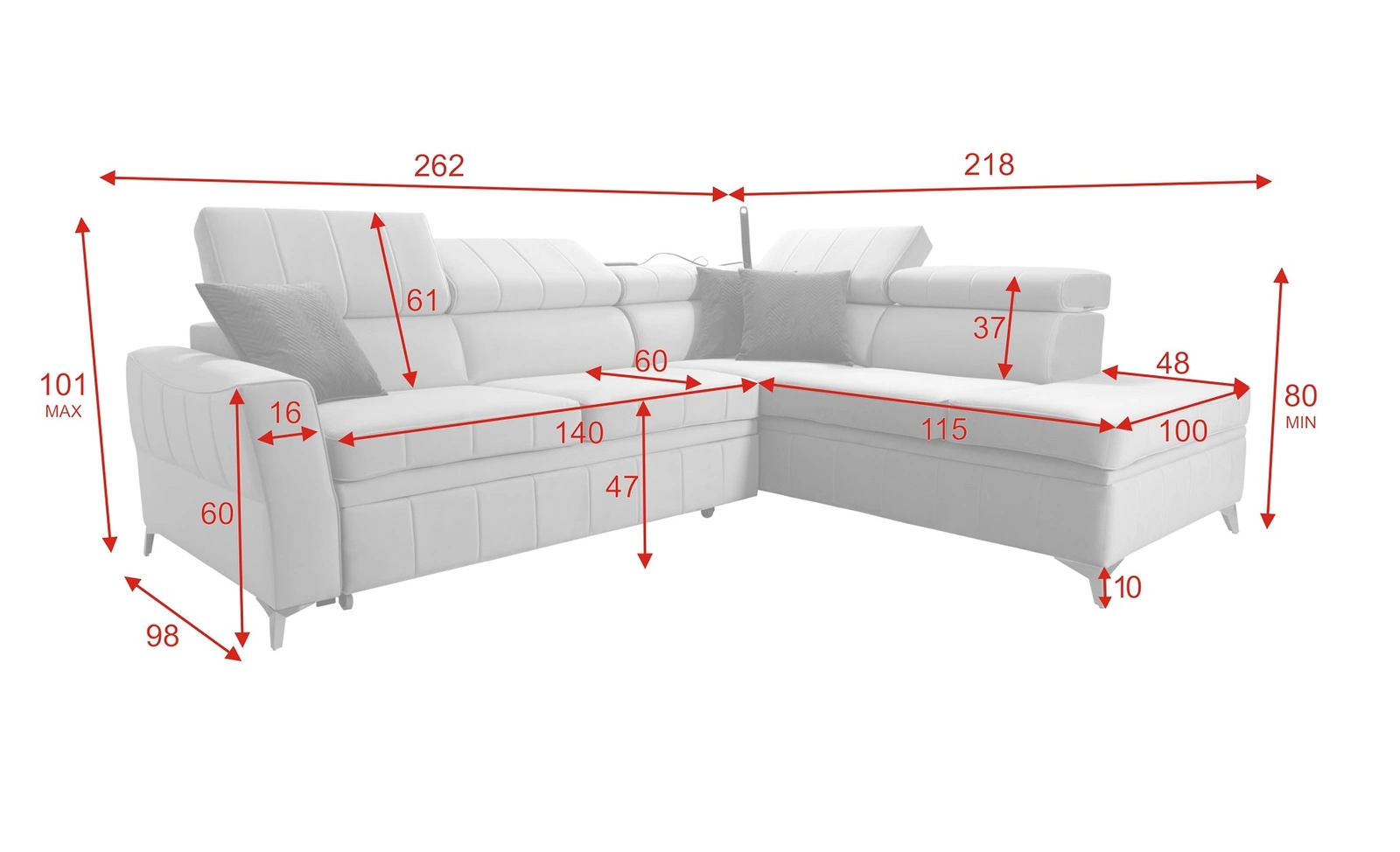 Wymiary mebla są optymalne. Szerokość narożnika 262 cm, wysokość maksymalna 101 cm oraz głębokość 218 cm. Powierzchnia spania narożnika wynosi 130x200 cm. Wysokość siedziska mebla to 47 cm a maksymalna wysokość oparcia wynosi 61 cm. Sprężyny faliste oraz pianka poliuretanowa T30 to materiał, z którego wykonane zostało siedzisko narożnika. Oparcie stałe z regulowanymi zagłówkami daje gwarancję wygodnego wypoczynku po długim dniu, które docenisz Ty, Twoi bliscy a także goście, którzy zasiądą na tym wyjątkowym narożniku!
