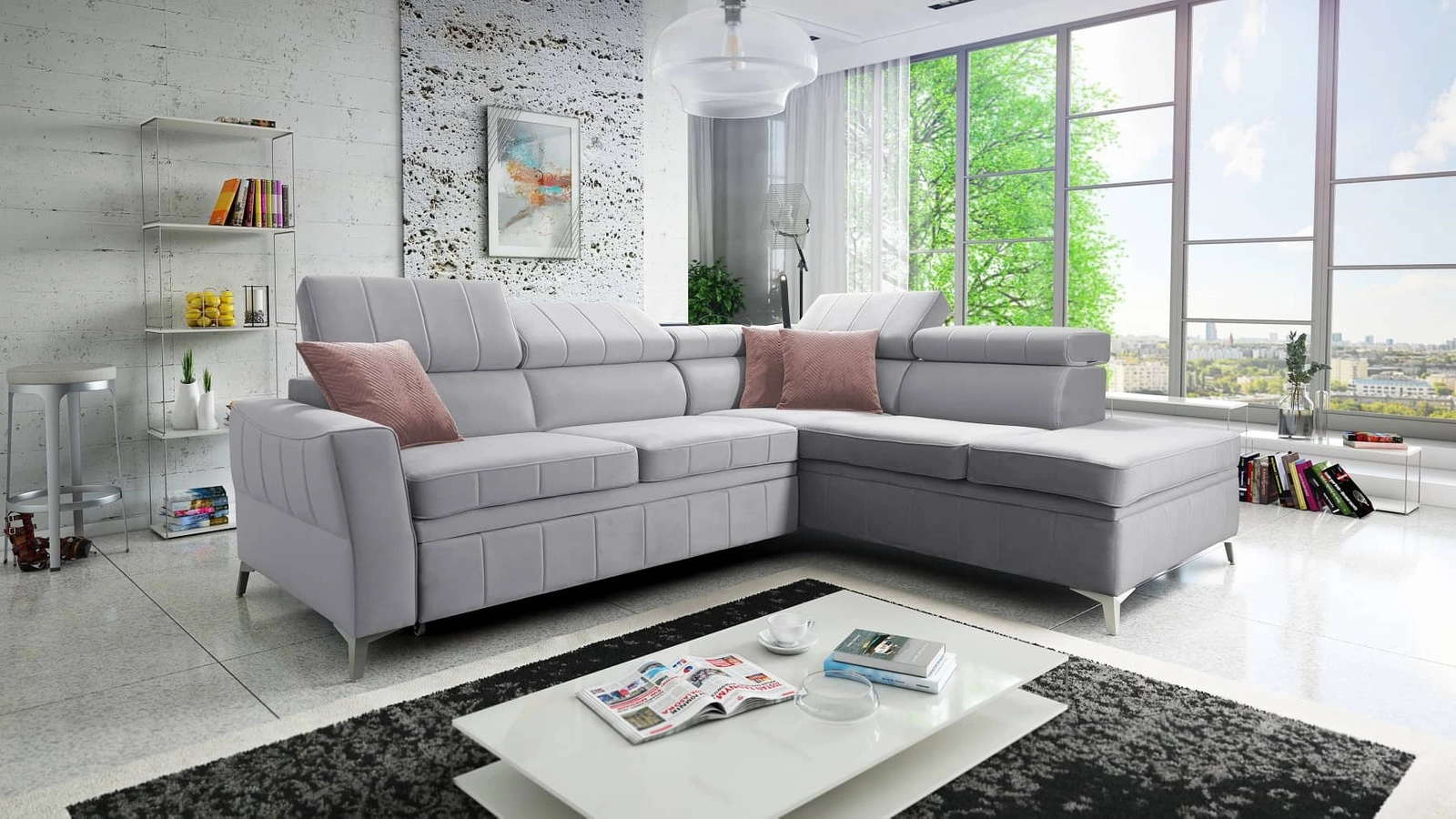 Narożnik Rava III w kolorze szary popiel z regulowanymi zagłówkami to elegancki mebel, który dopasuje się do każdej aranżacji.