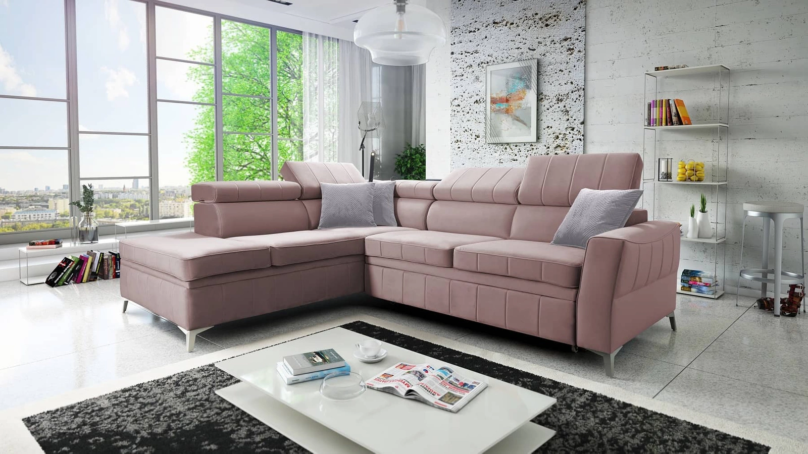 Narożnik Rava III w kolorze lawendowy róż z regulowanymi zagłówkami to elegancki mebel, który dopasuje się do każdej aranżacji.