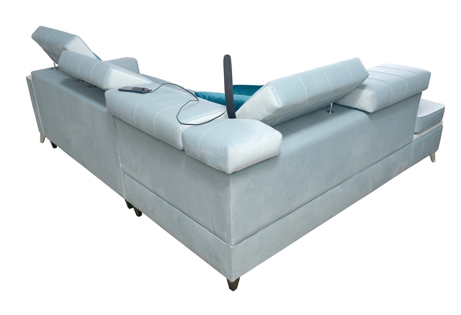 Narożnik z funkcją spania Rava III lawendowy róż lewostronny velvet komfortowy narożnik z regulowanymi zagłówkami i pojemnikiem na pościel