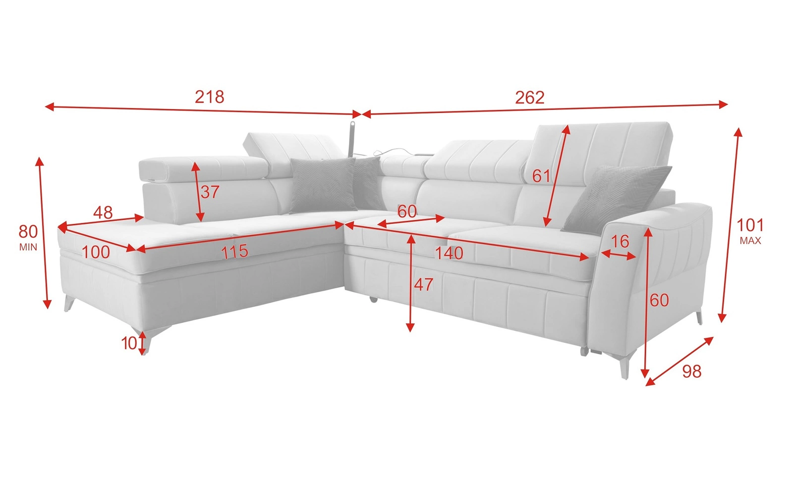 Wymiary mebla są optymalne. Szerokość narożnika 262 cm, wysokość maksymalna 101 cm oraz głębokość 218 cm. Powierzchnia spania narożnika wynosi 130x200 cm. Wysokość siedziska mebla to 47 cm a maksymalna wysokość oparcia wynosi 61 cm. Sprężyny faliste oraz pianka poliuretanowa T30 to materiał, z którego wykonane zostało siedzisko narożnika. Oparcie stałe z regulowanymi zagłówkami daje gwarancję wygodnego wypoczynku po długim dniu, które docenisz Ty, Twoi bliscy a także goście, którzy zasiądą na tym wyjątkowym narożniku!