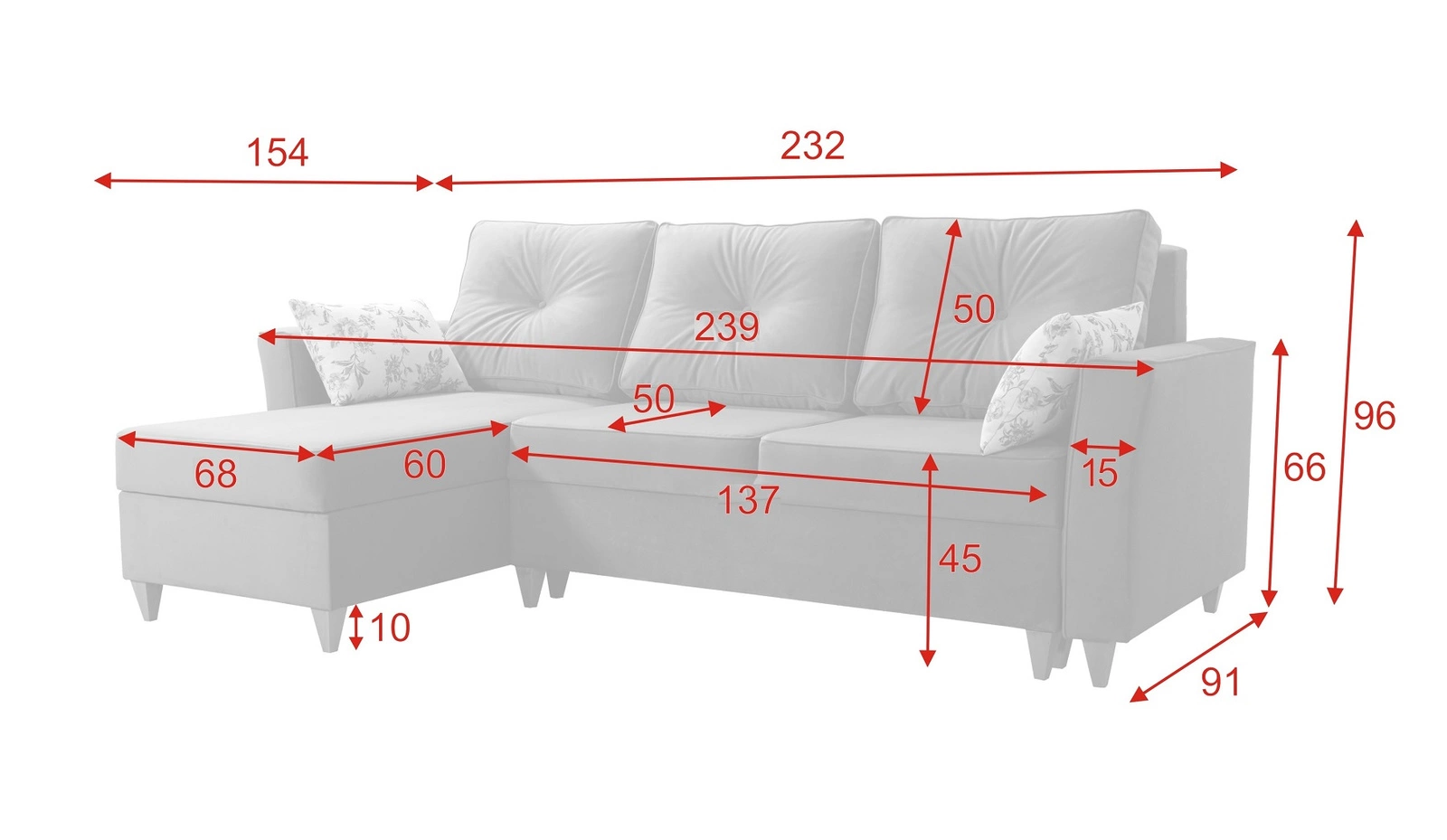 Wymiary mebla są optymalne. Szerokość narożnika 232 cm, wysokość 96 cm oraz głębokość 154 cm. Powierzchnia spania narożnika wynosi 132x205 cm. Wysokość siedziska mebla to 45 cm a maksymalna wysokość oparcia wynosi 50 cm. Sprężyny faliste oraz pianka poliuretanowa T30 to materiał, z którego wykonane zostało siedzisko narożnika. Oparcie poduchy daje gwarancję wygodnego wypoczynku po długim dniu, które docenisz Ty a także goście, którzy zasiądą na tym wyjątkowym narożniku.