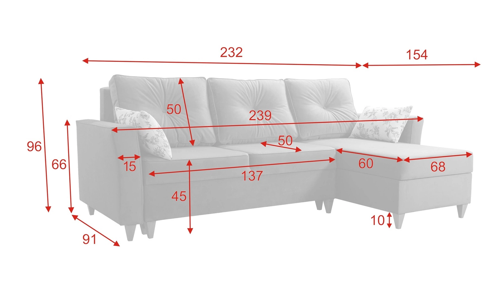 Wymiary mebla są optymalne. Szerokość narożnika 232 cm, wysokość 96 cm oraz głębokość 154 cm. Powierzchnia spania narożnika wynosi 132x205 cm. Wysokość siedziska mebla to 45 cm a maksymalna wysokość oparcia wynosi 50 cm. Sprężyny faliste oraz pianka poliuretanowa T30 to materiał, z którego wykonane zostało siedzisko narożnika. Oparcie poduchy daje gwarancję wygodnego wypoczynku po długim dniu, które docenisz Ty a także goście, którzy zasiądą na tym wyjątkowym narożniku.