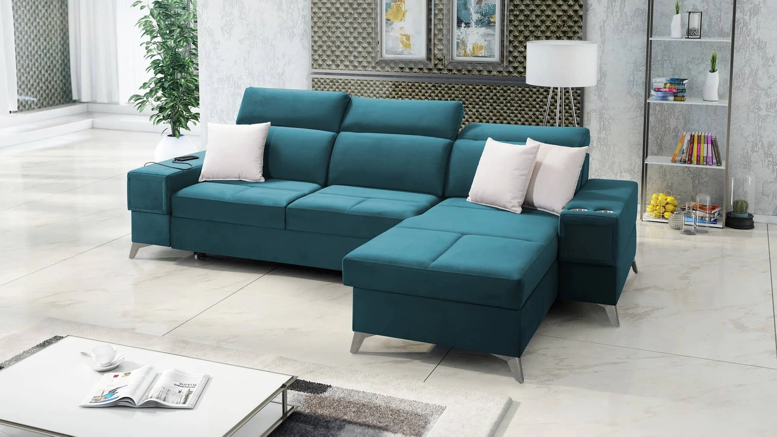 Narożnik Elgin w kolorze turkusowym z regulowanymi zagłówkami to zachwycający mebel z gwarancją najwyższego komfortu i funkcjonalności.