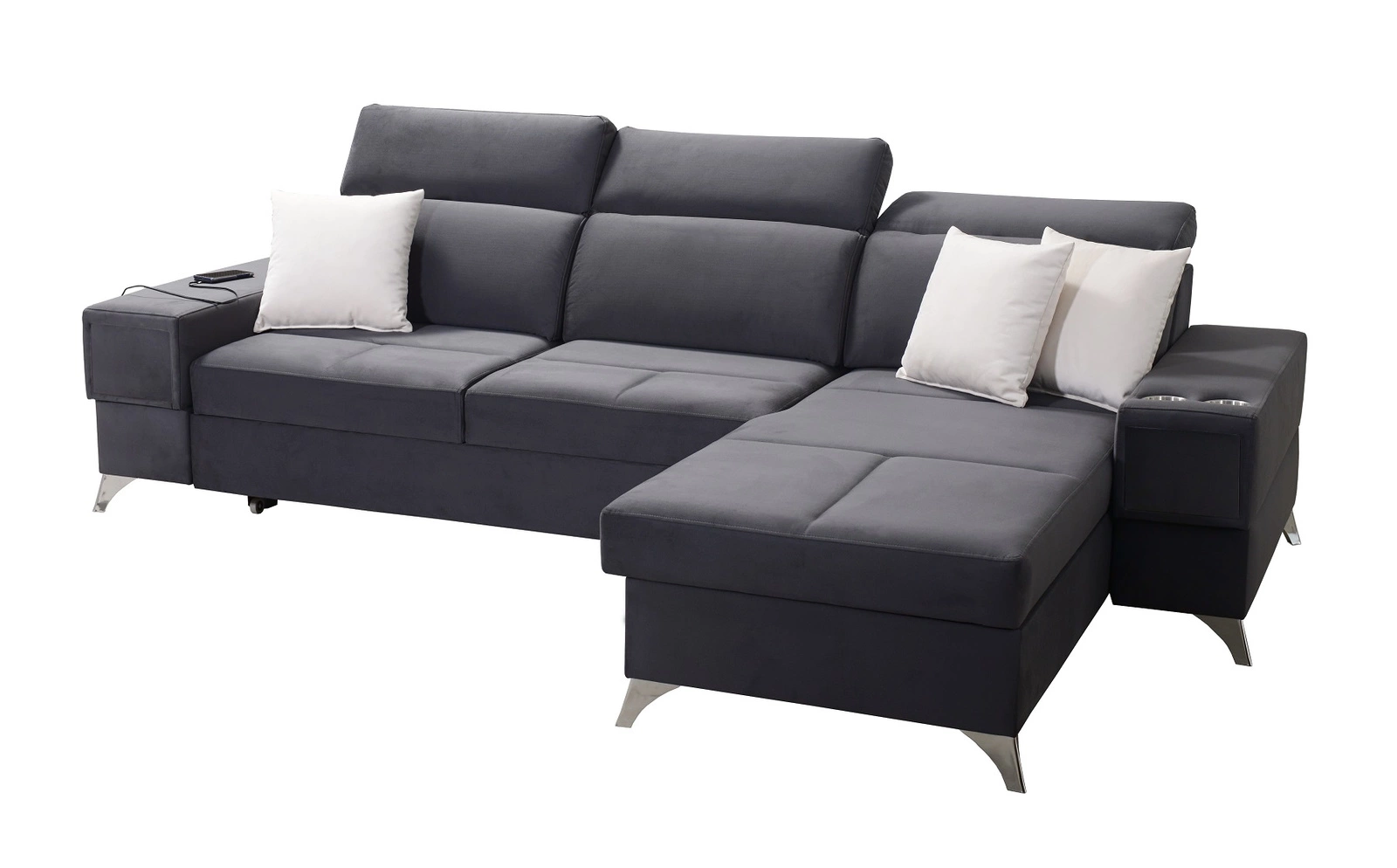 Dodatki tego mebla, które docenią wszyscy użytkownicy to pojemnik na pościel, funkcja spania, uchwyty na kubki, gniazdo ładowania USB w boczku narożnika oraz praktyczne szuflady w boczku mebla.