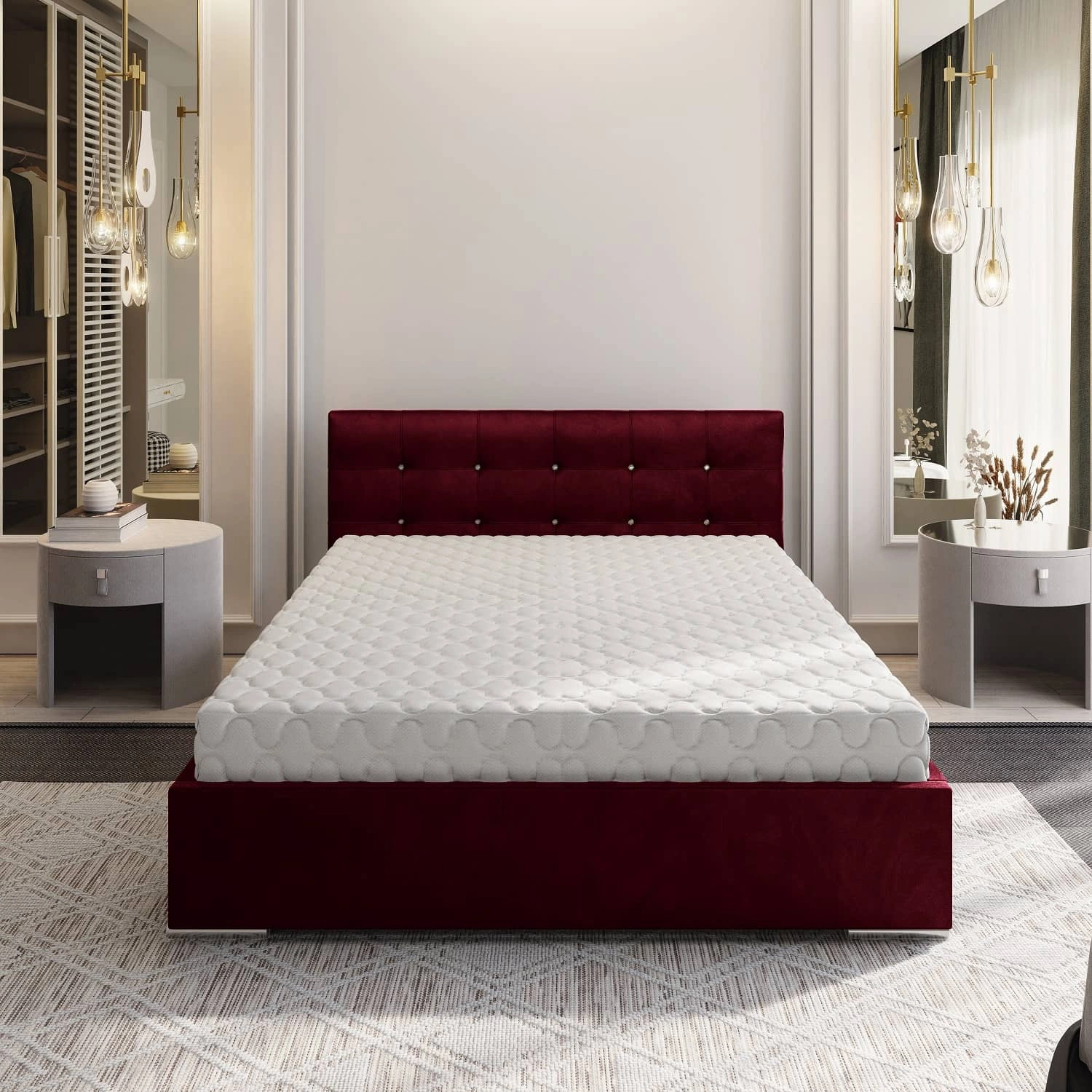 Łóżko tapicerowane Mona 140x200 bordowe z pojemnikiem w nowoczesnym skandynawskim stylu z pikowanym zagłówkiem z kryształkami