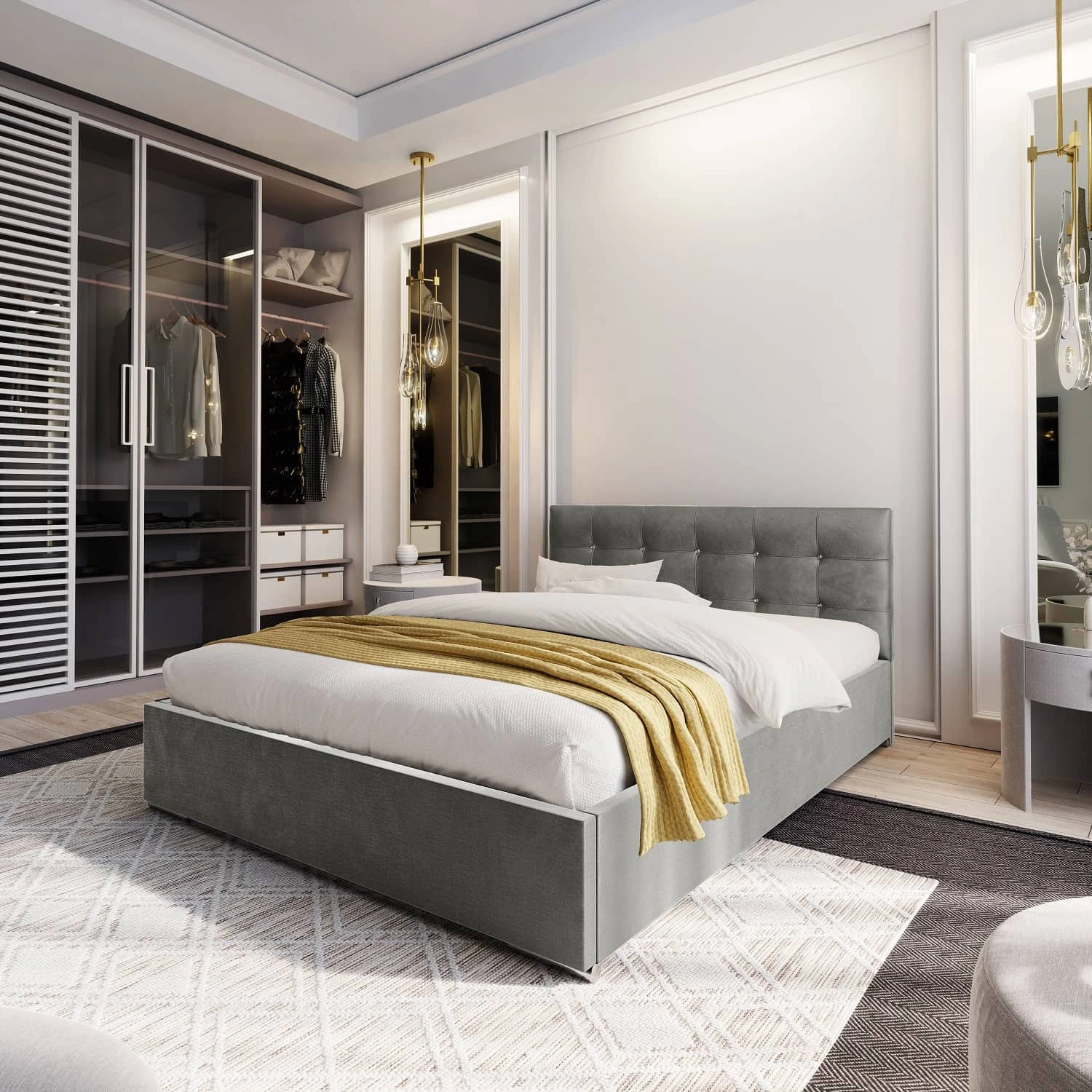 Łóżko tapicerowane Mona 140x200 szare z pojemnikiem w nowoczesnym skandynawskim stylu z pikowanym zagłówkiem z kryształkami