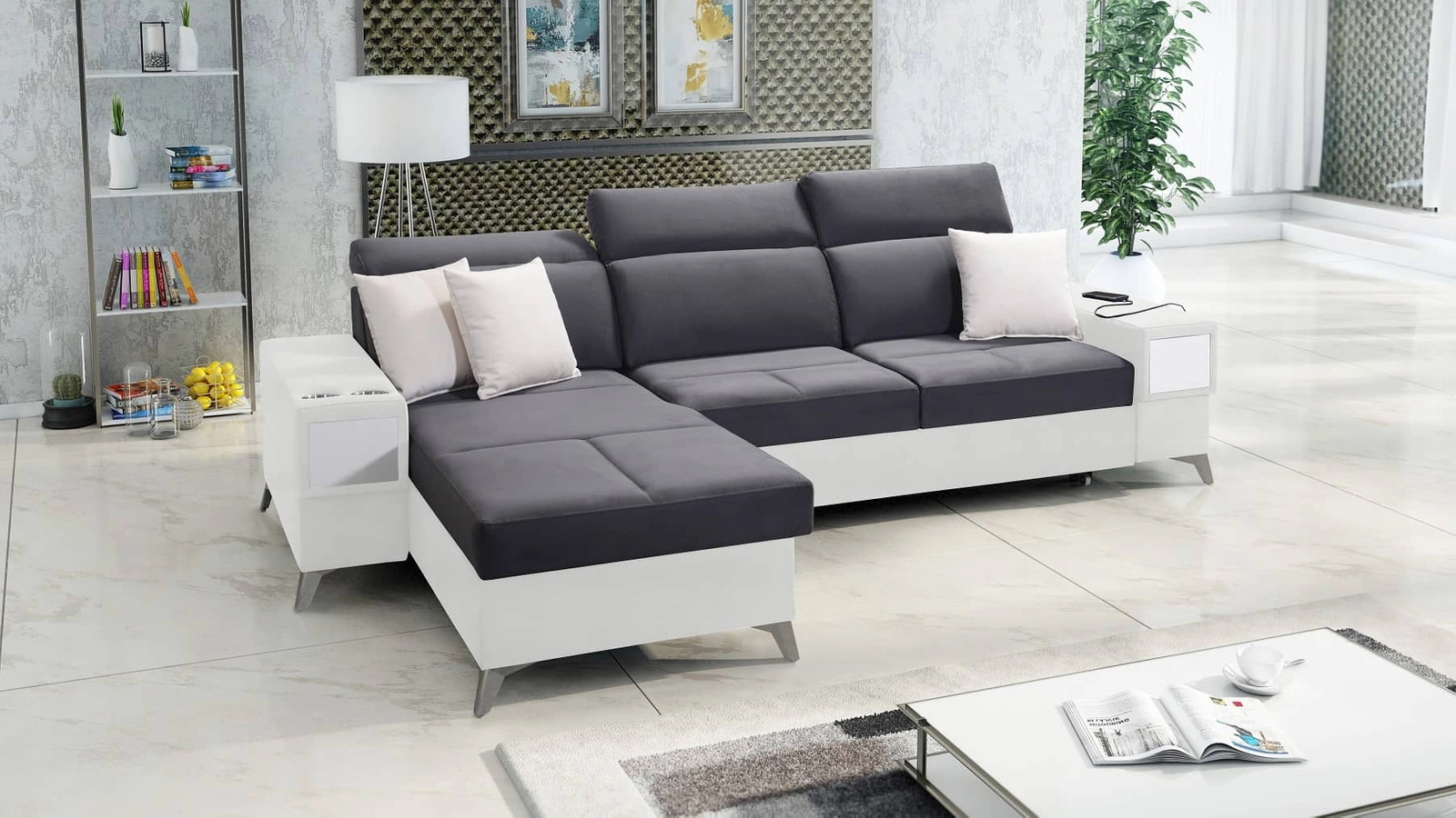 Narożnik z funkcją spania Elgin grafitowy / biały lewostronny narożnik z regulowanymi zagłówkami praktyczne szuflady w boczkach mebla