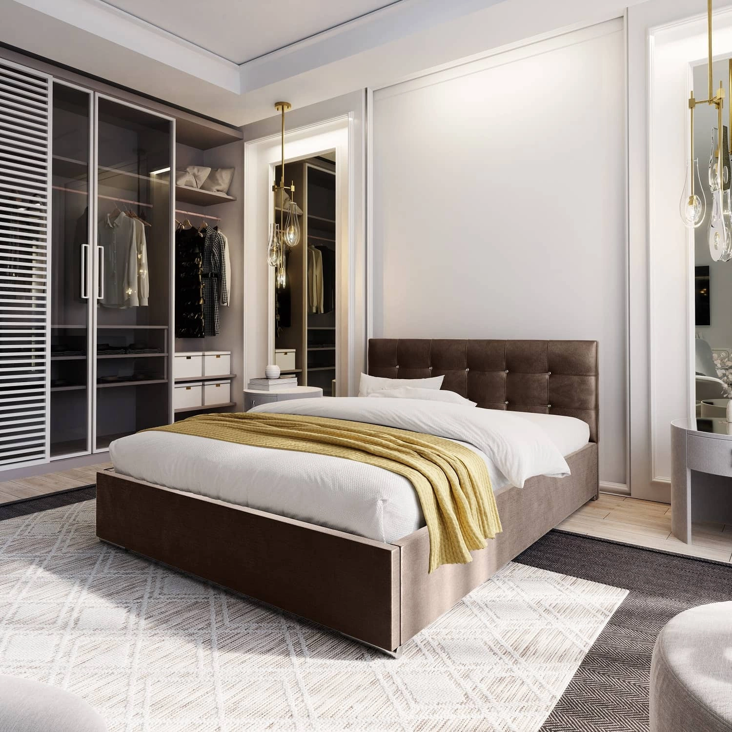 Łóżko tapicerowane Mona 180x200 jasny brąz z pojemnikiem w nowoczesnym skandynawskim stylu z pikowanym zagłówkiem z kryształkami