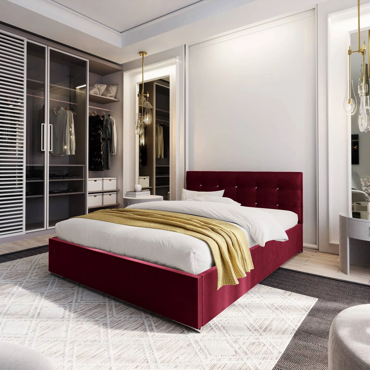 Łóżko tapicerowane Mona 180x200 bordowe z pojemnikiem w nowoczesnym skandynawskim stylu z pikowanym zagłówkiem z kryształkami