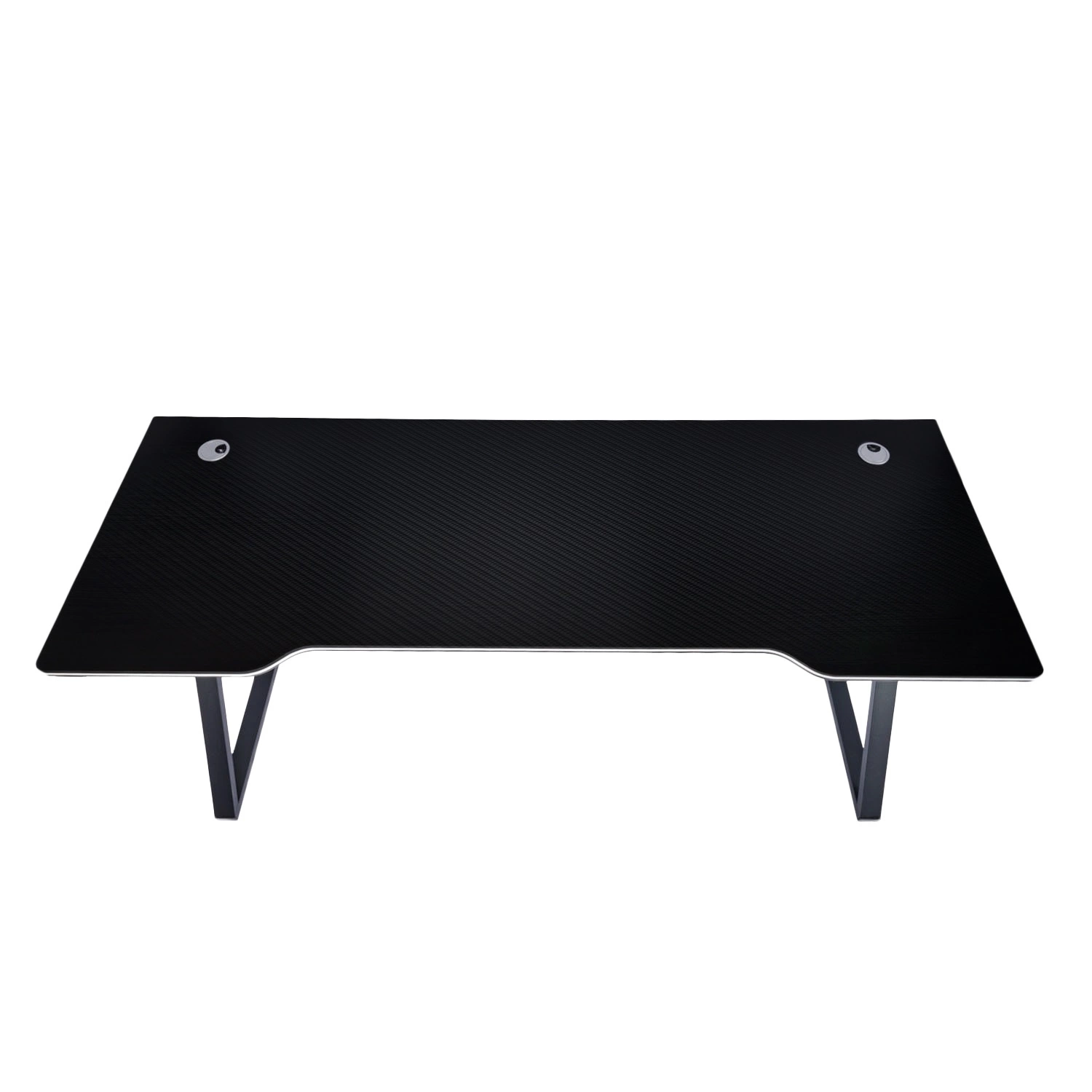Blat biurka o wymiarach 160x60 cm w całości pokryty został karbonem co zapewnia precyzję i niezawodność. Wcięcie w blacie pozwala na wygodną pozycję oraz na ustawienie nawet trzech monitorów. Wytrzymała konstrukcja wykonana z metalowych profili pomalowanych proszkowo na kolor czarny gwarantuje dużą stabilność, a unikalny kształt designerski wygląd. Dodatkowym atutem biurka są dwa przepusty kablowe. Zapewnia to łatwe ustawienie i podłączenie niezbędnych sprzętów gamingowych oraz innych akcesoriów potrzebnych do pracy lub nauki.