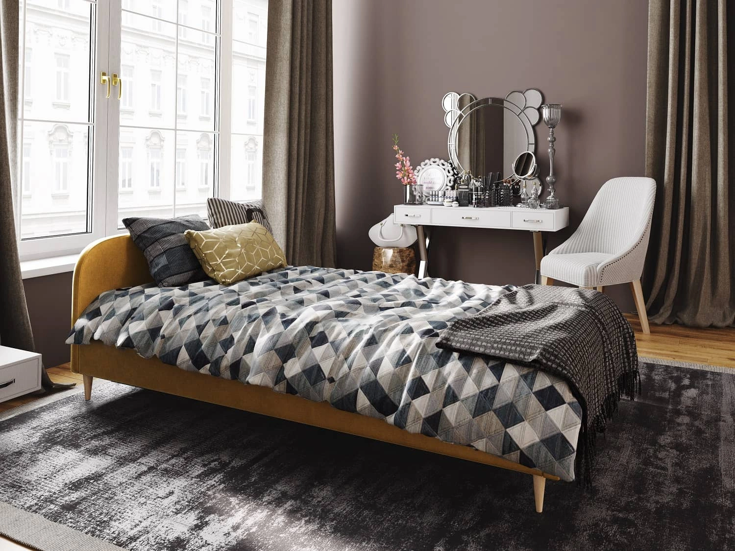 Łóżko tapicerowane Ivrea 90x200 w kolorze musztardowym to stylowy mebel, który idealnie wkomponuje się do pokoju nastolatka czy małej sypialni.