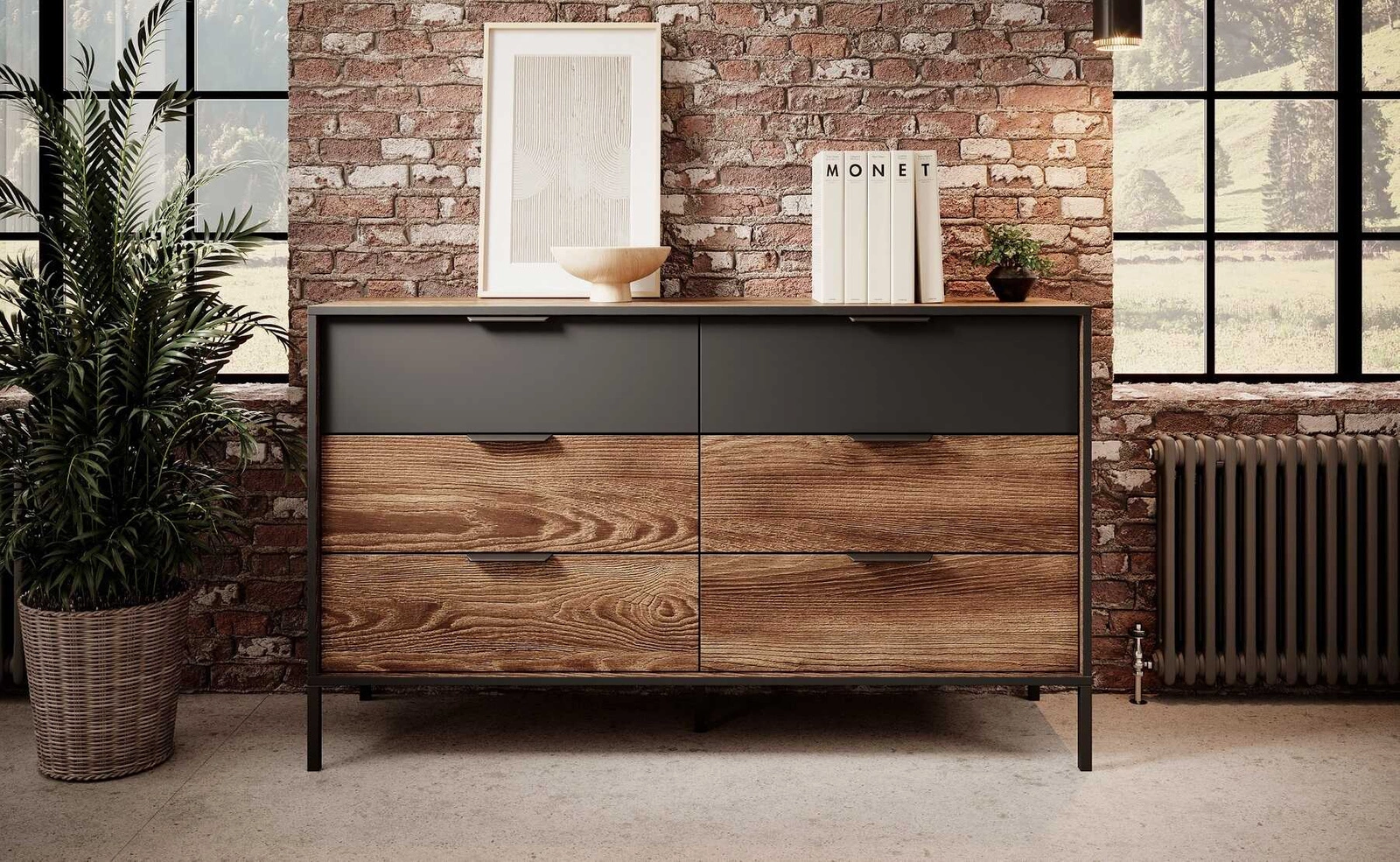 Komoda z szufladami Dover w kolorze kasztan / antracyt to odważna propozycja do wnętrz o nowoczesnym charakterze.