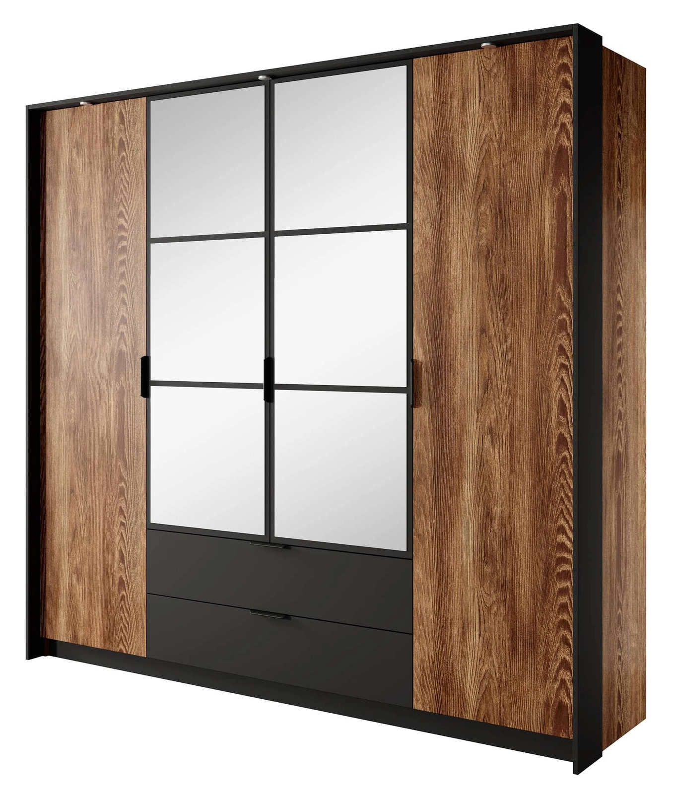 Meble wykonane zostały z wysokiej jakości płyty laminowanej o grubości 16mm, która charakteryzuje się odpornością na wpływ czynników zewnętrznych takich jak obicia, uderzenia i niefortunne zadrapania. Stylowym wykończeniem frontów mebli są uchwyty krawędziowe w kolorze czarnym. Konstrukcja łóżka z częściowo tapicerowanym zagłówkiem zapewnia dużą stabilność i wygodę użytkowania. Łóżko wyposażone jest w stabilny metalowy stelaż pod materac oraz praktyczny pojemnik na pościel. Szafa dzieli się na część z drążkiem i część z półkami. Środkowe drzwi zostały wykończone lustrami w ciekawej konfiguracji. Konstrukcję komody urozmaicono czarnymi metalowymi nogami, które gwarantują stabilność całej bryły. Szafki nocne oraz szafa wyposażone są w subtelne oświetlenie LED, dzięki czemu bryły zyskują wizualną lekkość.