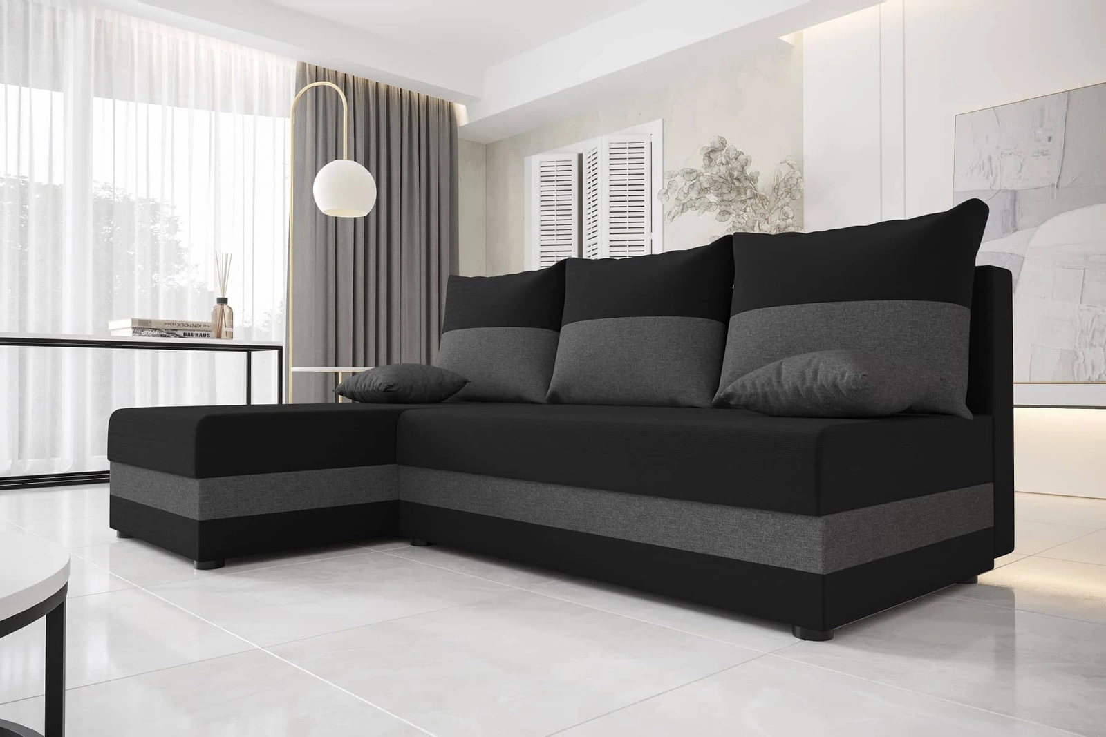 Narożnik z funkcją spania Bowers czarny / grafitowy lewostronny narożnik z pojemnikiem na pościel gwarancja najwyższego komfortu