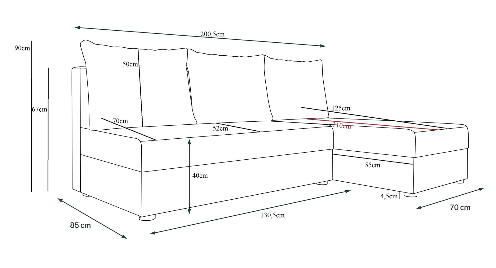 Dzięki swoim optymalnym wymiarom oraz szerokiej funkcjonalności narożnik z funkcją spania świetnie sprawdzi się jako narożnik do pokoju dziennego lub jako narożnik rozkładany do pokoju nastolatka. Szerokość narożnika 200,5 cm, wysokość maksymalna 90 cm oraz głębokość 140 cm. Powierzchnia spania narożnika wynosi 131x201 cm. Wysokość siedziska mebla to 40 cm a maksymalna wysokość oparcia wynosi 50 cm. Sprężyny faliste oraz pianka poliuretanowa T30 to materiały, z którego wykonane zostało siedzisko narożnika. Oparcie poduchy wypełnione zmieloną pianką poliuretanową daje gwarancję wygodnego wypoczynku po długim dniu, które docenisz Ty, Twoi bliscy a także goście, którzy zasiądą na tym wyjątkowym narożniku!