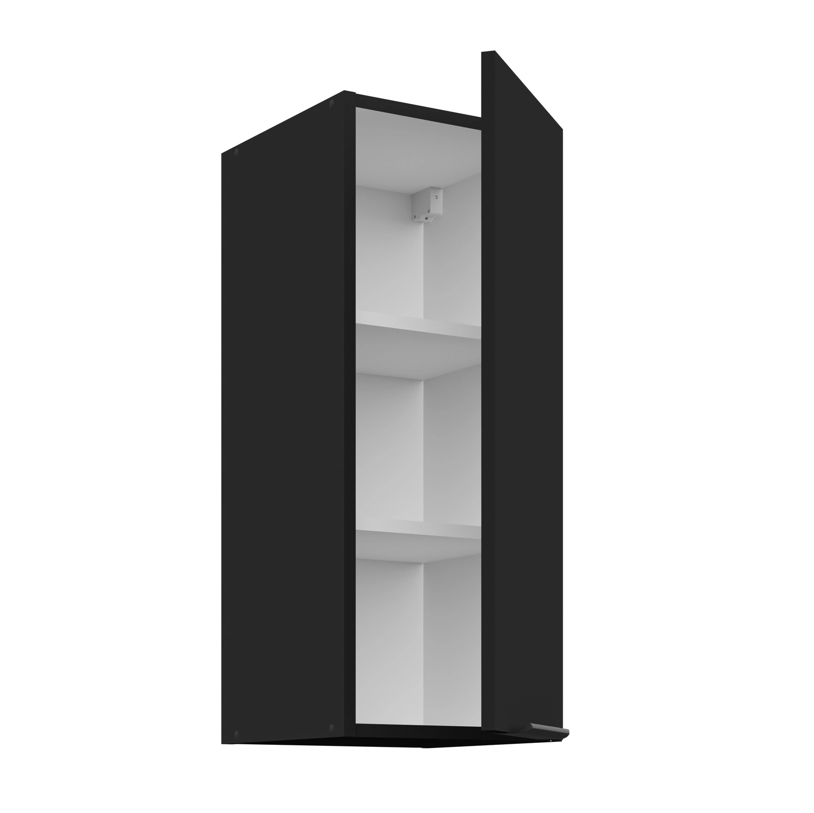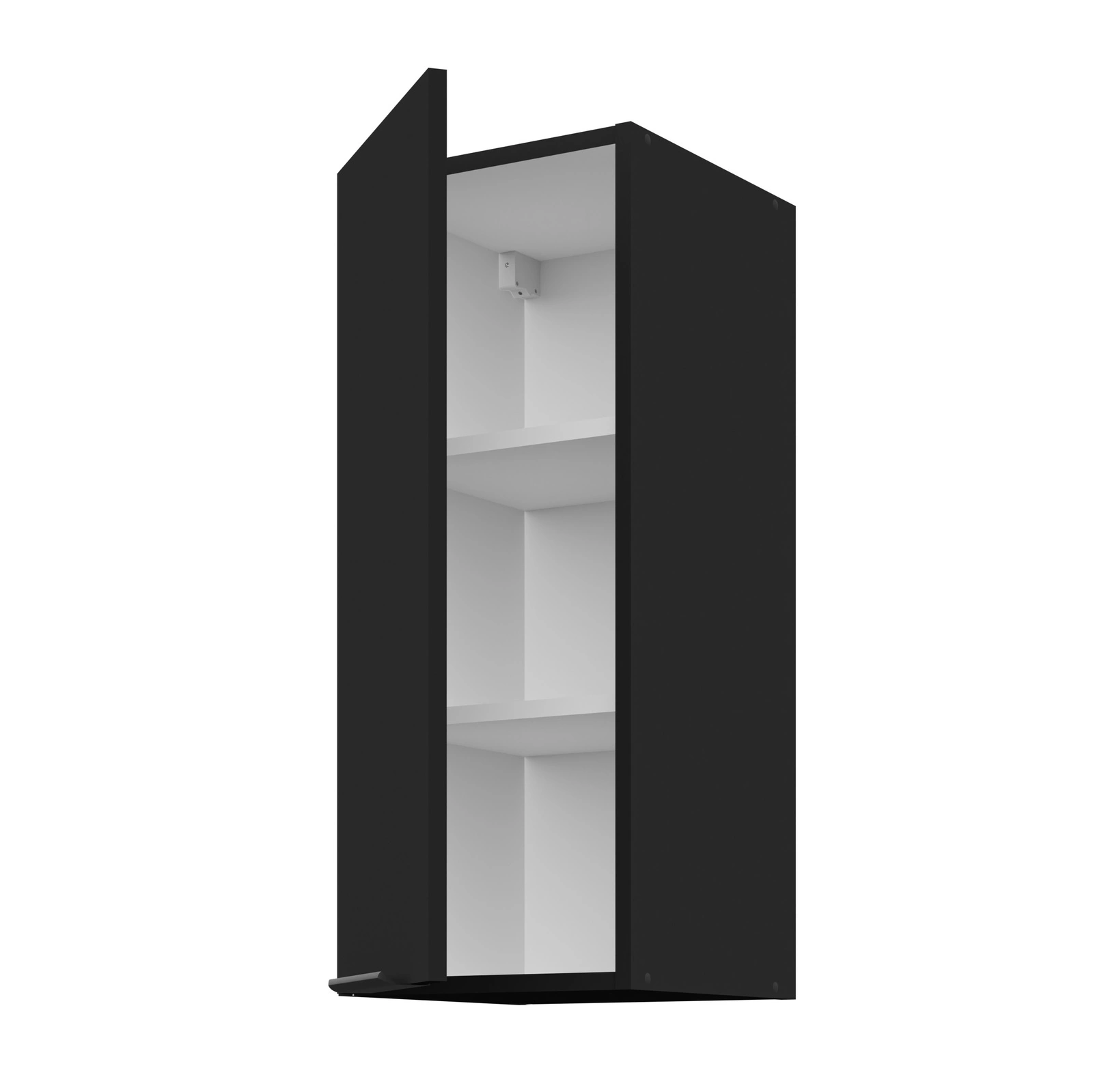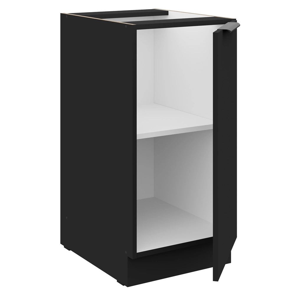 Dzięki uniwersalnemu ustawieniu, meble kuchenne dopasują się do wnętrza każdej kuchni. Fronty w kolorze czarnym o wykończeniu matowym podkreślają elegancje szafek kuchennych. Stylowym dopełnieniem frontów szafek kuchennych są czarne, metalowe uchwyty krawędziowe, które poza swoją podstawową funkcją dodają meblom szczególnego charakteru.