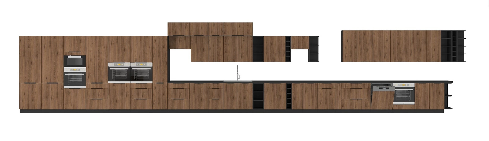Front szafki kuchennej w kolorze orzech okapi został wykonany z płyty laminowanej. Front wykazuje wysoką wytrzymałość na działanie wilgoci oraz przypadkowe uszkodzenia. Stylowym dopełnieniem frontów szafki kuchennej są czarne, metalowe uchwyty krawędziowe, które poza swoją podstawową funkcją dodają szczególnego charakteru. System cichego domykania zwiększa komfort i bezpieczeństwo użytkowania mebli.