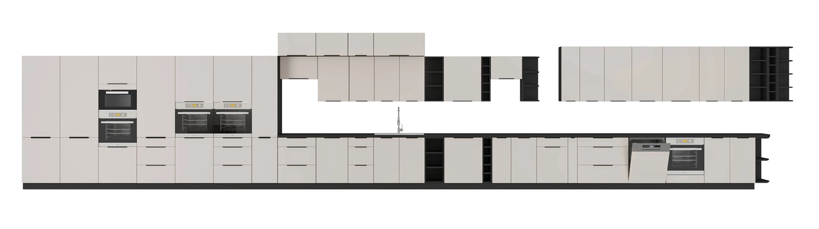 Drzwi szafki kuchennej w kolorze beżowym zostały wykonane z płyty laminowanej. Fronty wykazują wysoką wytrzymałość na działanie wilgoci oraz przypadkowe uszkodzenia. Stylowym dopełnieniem frontów szafki kuchennej są czarne, metalowe uchwyty krawędziowe, które poza swoją podstawową funkcją dodają szczególnego charakteru.