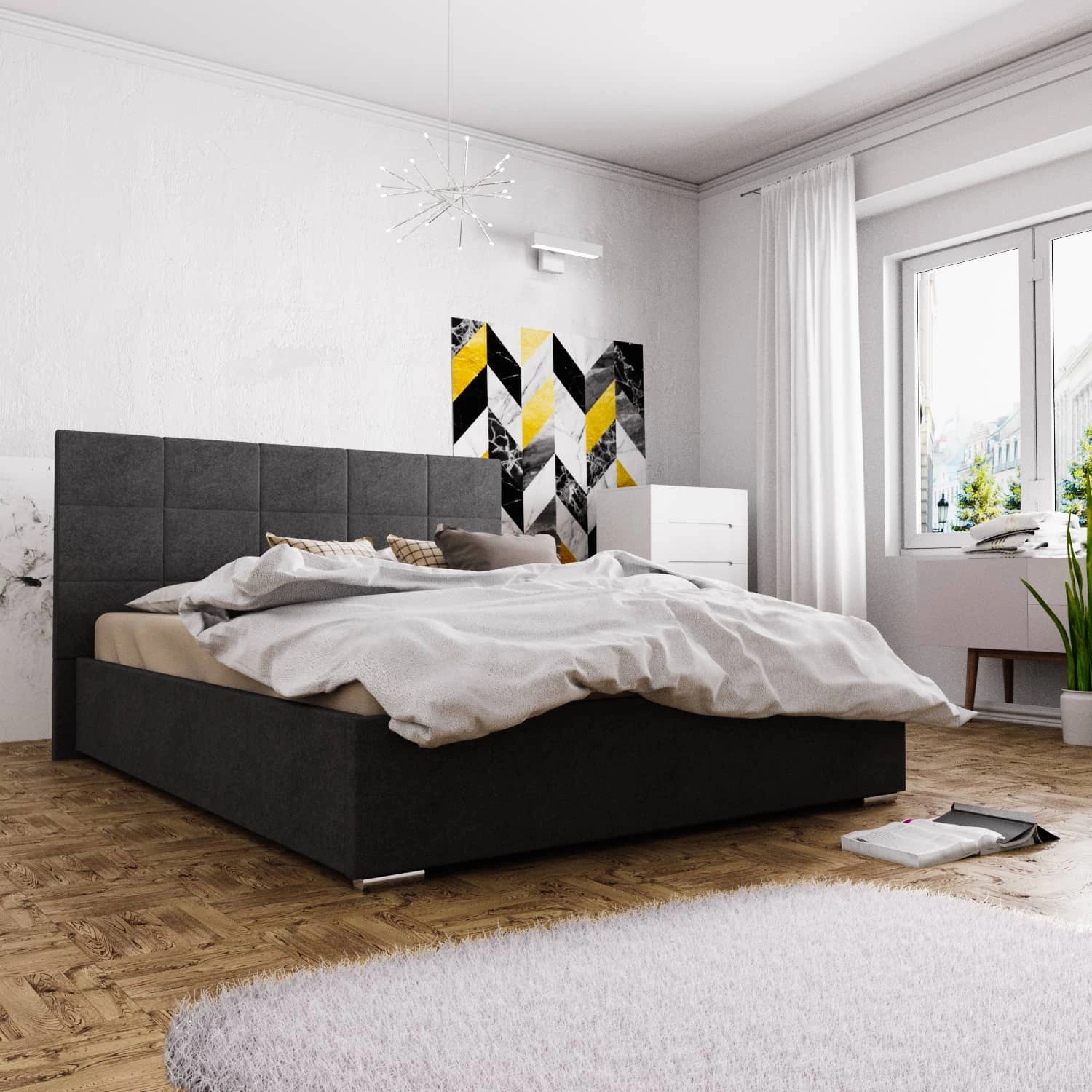 Łóżko tapicerowane Eljas 140x200 w kolorze czarnym to idealne rozwiązanie do sypialni urządzonej w stylu nowoczesnym oraz klasycznym.