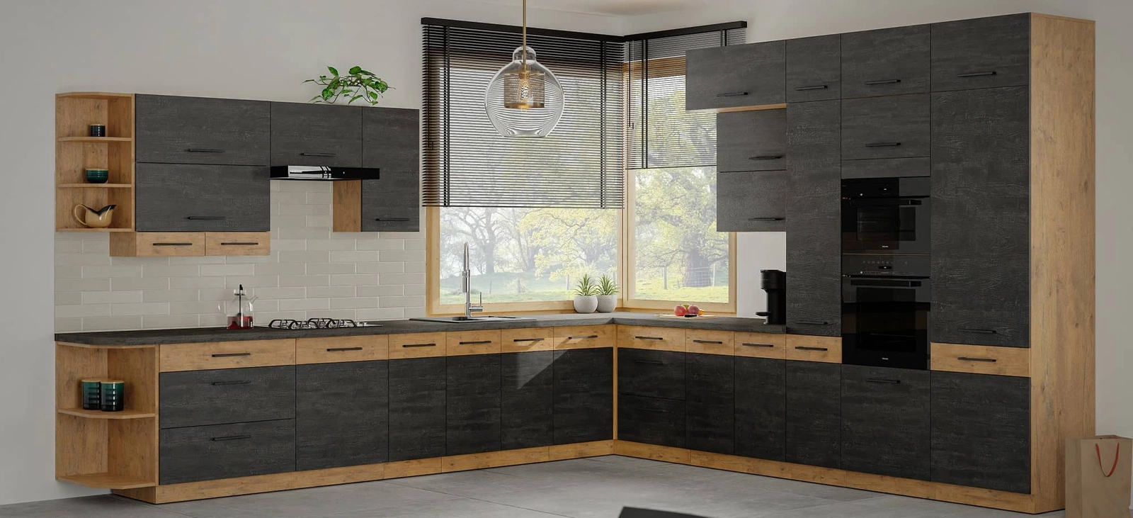 Stylowym dopełnieniem frontów szafki kuchennej są czarne uchwyty, które poza swoją podstawową funkcją, nadają meblom szczególnego charakteru.