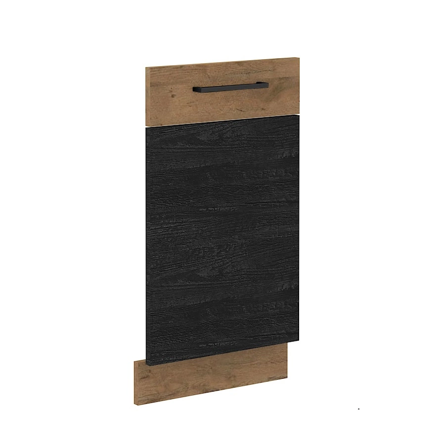Front do zmywarki 45 cm Vanimo w kolorze ciemnego drewna wykonany z płyty laminowanej został przełamany wstawką w kolorze dąb lancelot.